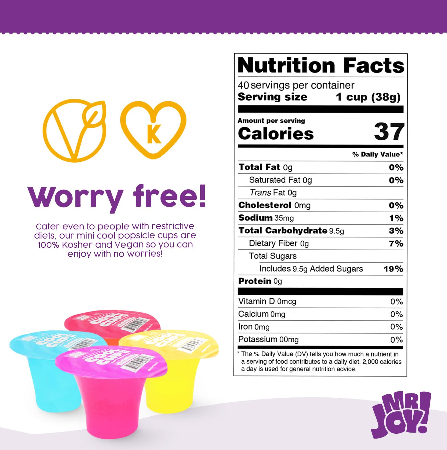 MR JOY MINI COOL CUPS are designed for ease of use and maximum enjoyment. Each pack contains 40 assorted cups of Italian ice that can be stored safely in your pantry until you are ready to enjoy them. Simply freeze the cups for 6+ hours, squeeze, and relish in the refreshing flavors. With a perfect balance of fruity aromas and a texture that is not overly hard, these Italian ices deliver an enjoyable treat that everyone will love.