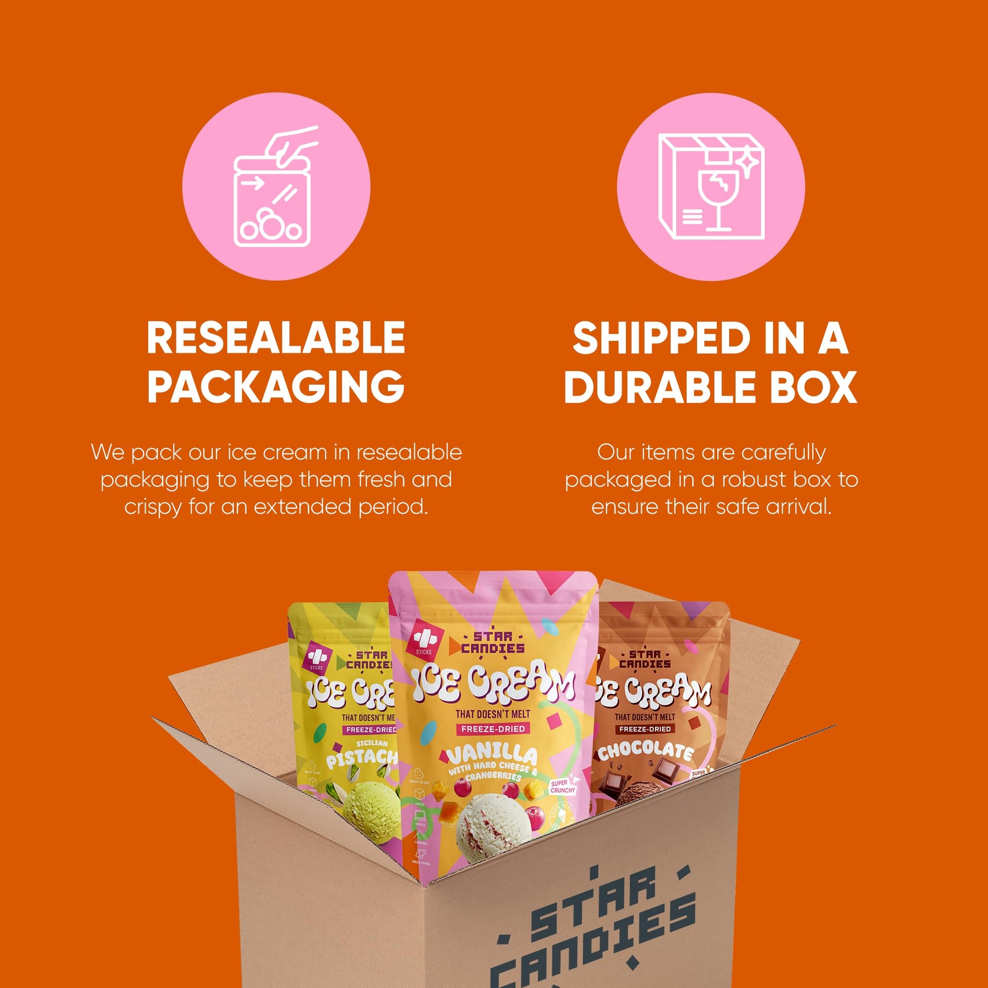 - Q: What makes Star Candies Freeze Dried Ice Cream different from regular ice cream? A: Star Candies Freeze Dried Ice Cream combines the creamy essence of ice cream with a crunchy texture, achieved through a special freeze-drying process. Unlike regular ice cream, it doesn't melt, making it a mess-free snack perfect for outdoor adventures and on-the-go enjoyment.