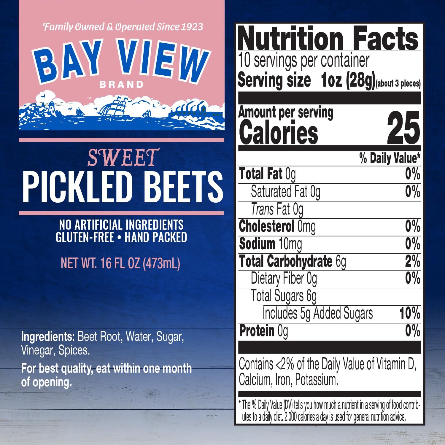 Q: What are the ingredients in Bay View Sweet Pickled Beets?A: Bay View Sweet Pickled Beets are crafted using premium locally grown beets, vinegar, natural sugar, and a blend of aromatic spices, ensuring a bold, tangy-sweet flavor.