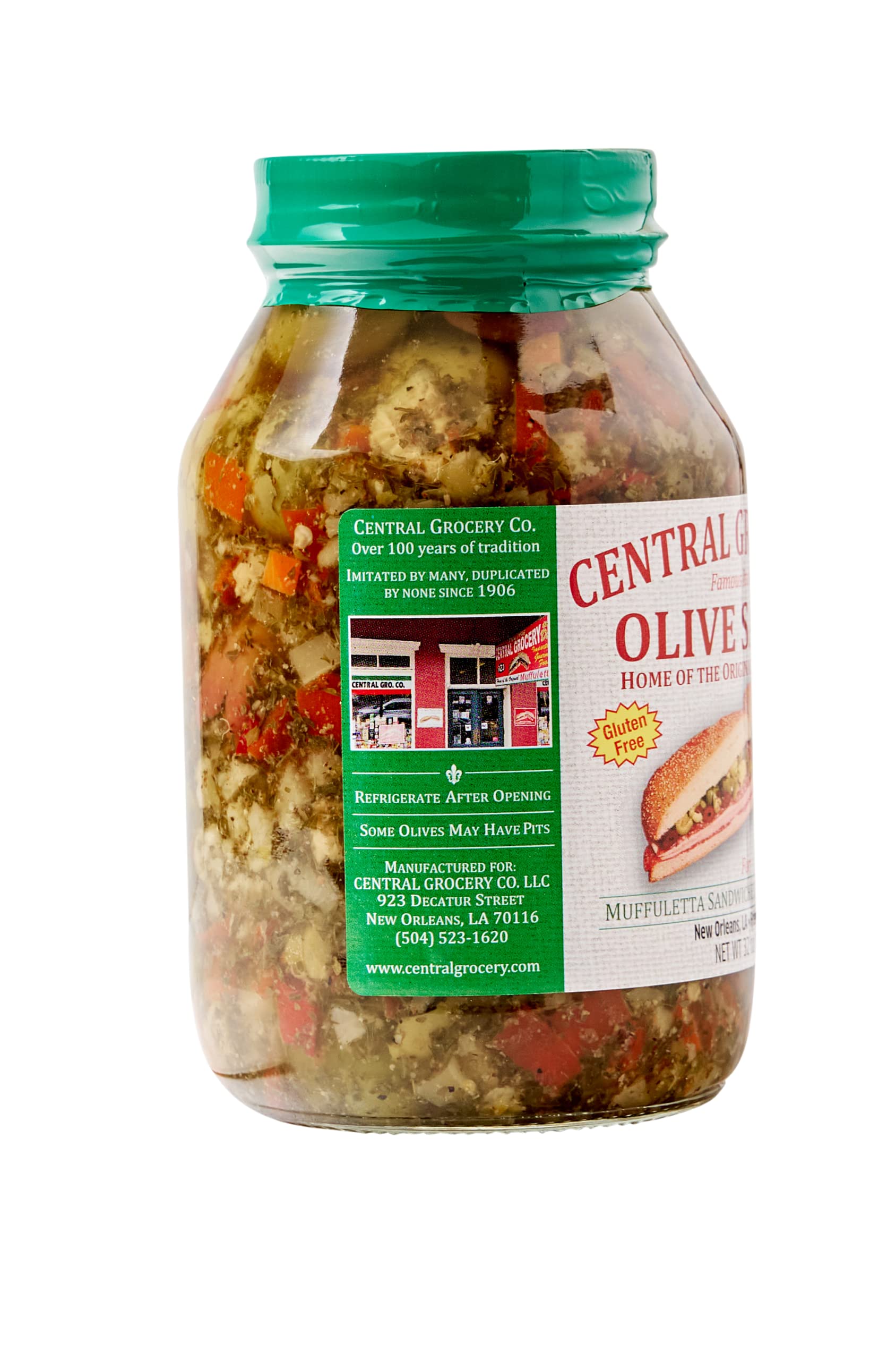 Q: What is Central Grocery Olive Salad and how is it used?A: Central Grocery Olive Salad is an authentic Italian olive salad made with a blend of olives, pimentos, vegetables, and a savory oil mix. It's perfect for making Muffuletta sandwiches, topping pizzas, enhancing salads, or adding flavor to pastas and hot dogs.