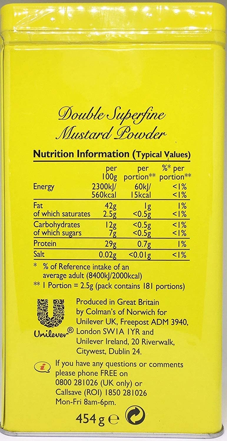 - Q: Is Colman's Dry Mustard Powder suitable for all diets? A: Colman's Dry Mustard Powder is generally gluten-free and contains no artificial additives, making it suitable for various diets. However, always check the packaging for specific dietary concerns or allergens.
