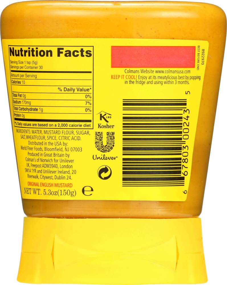 - Q: Is Colman's Squeezy Mustard suitable for special diets? A: Yes, Colman's Squeezy Mustard is all-natural, kosher, vegan, and keto-friendly. It is a low-calorie condiment that can fit into various dietary preferences while adding a delicious kick to your meals.