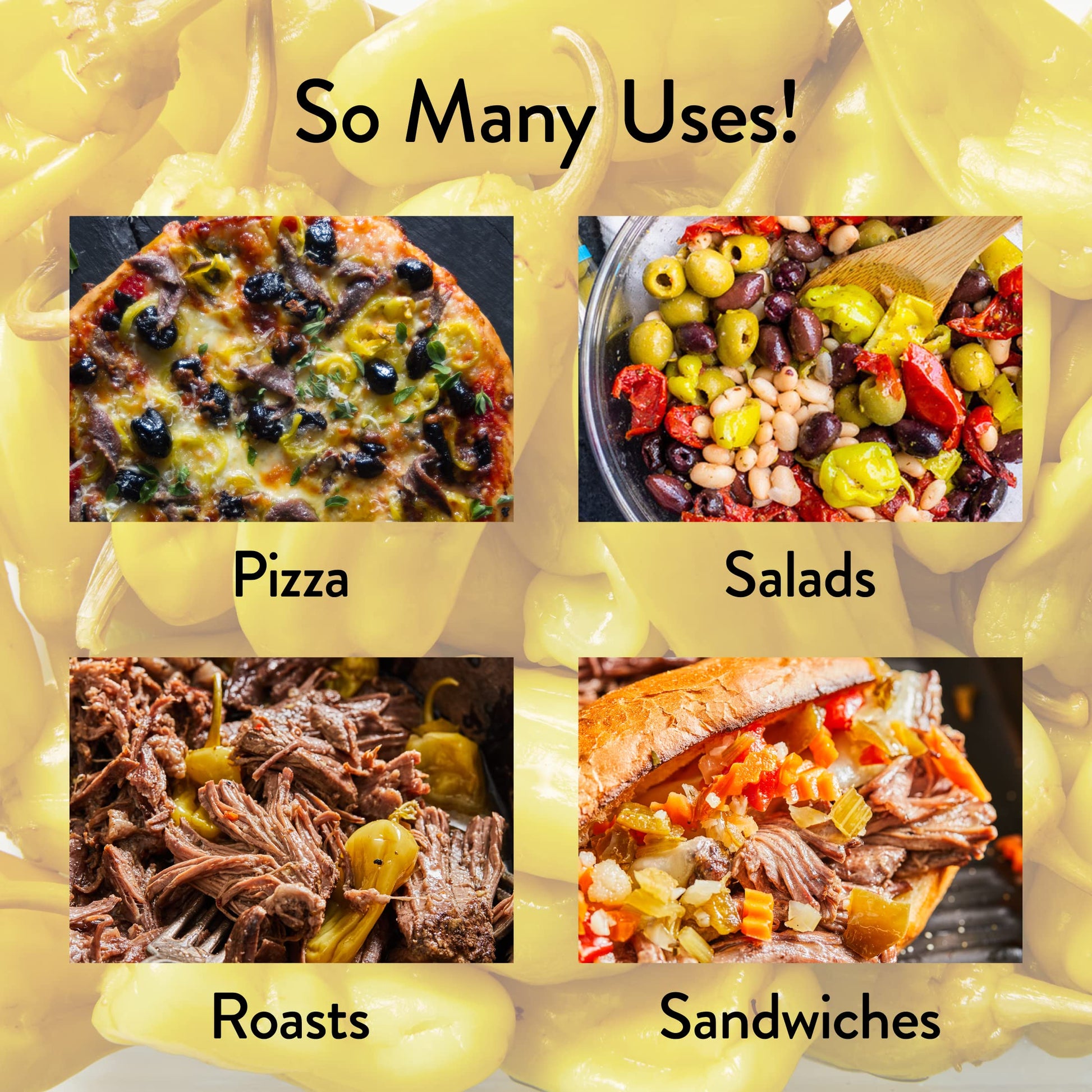 Known as a zesty sandwich accompaniment and must-have antipasto garnish, these piquant little peppers are made to bring a bold, flavorful zing to your favorite foods. Garnish wraps, sandwiches, salads, pizzas and antipasto trays… or snack on them straight from the jar. We won’t tell!