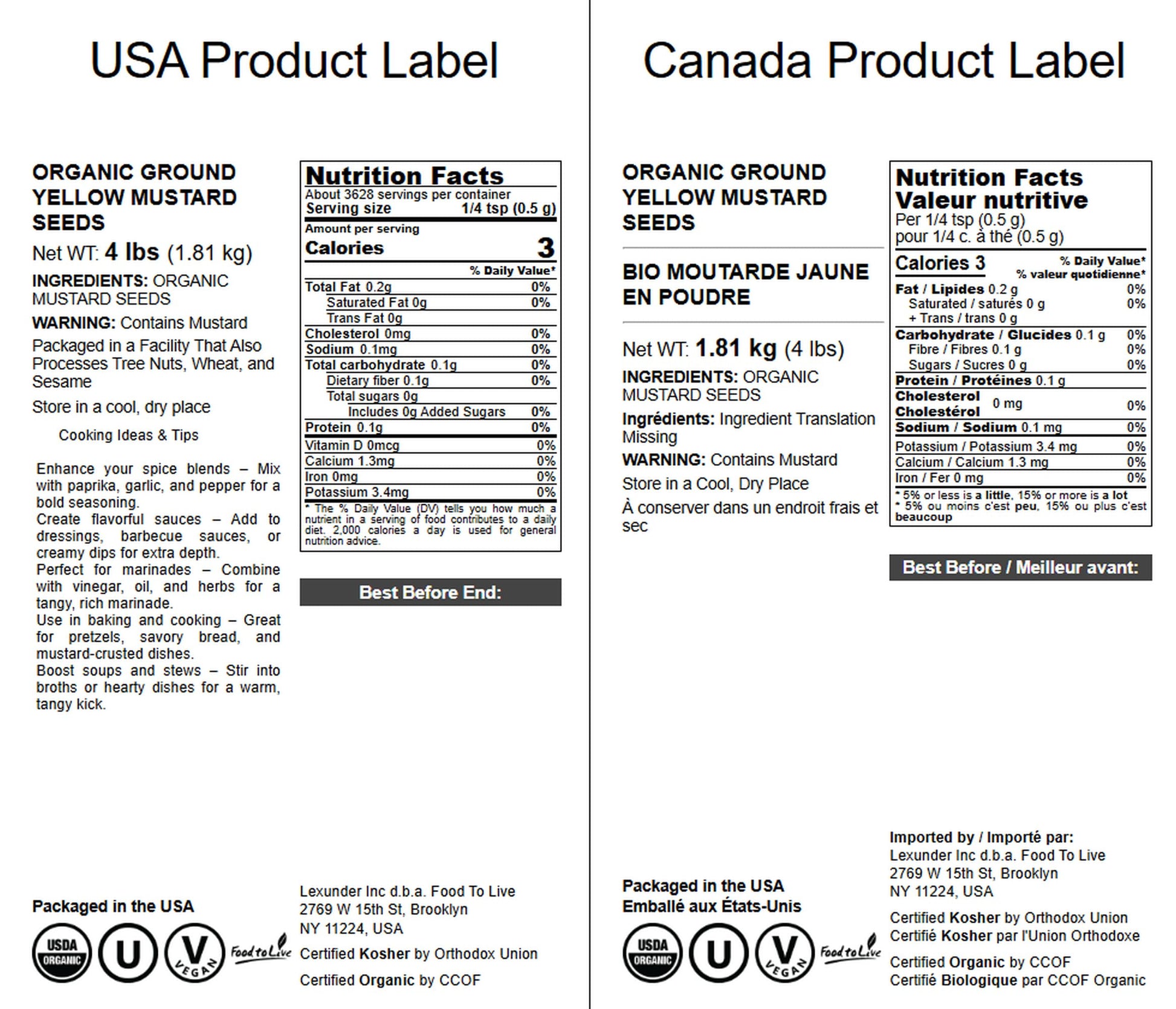 - Q: What makes Organic Ground Yellow Mustard Seeds different from regular mustard? A: Organic Ground Yellow Mustard Seeds are finely ground for a smooth texture, allowing them to blend seamlessly into recipes. Unlike regular mustard condiments, this spice provides a concentrated flavor that can be adjusted according to personal preferences, making it a versatile culinary ingredient.
