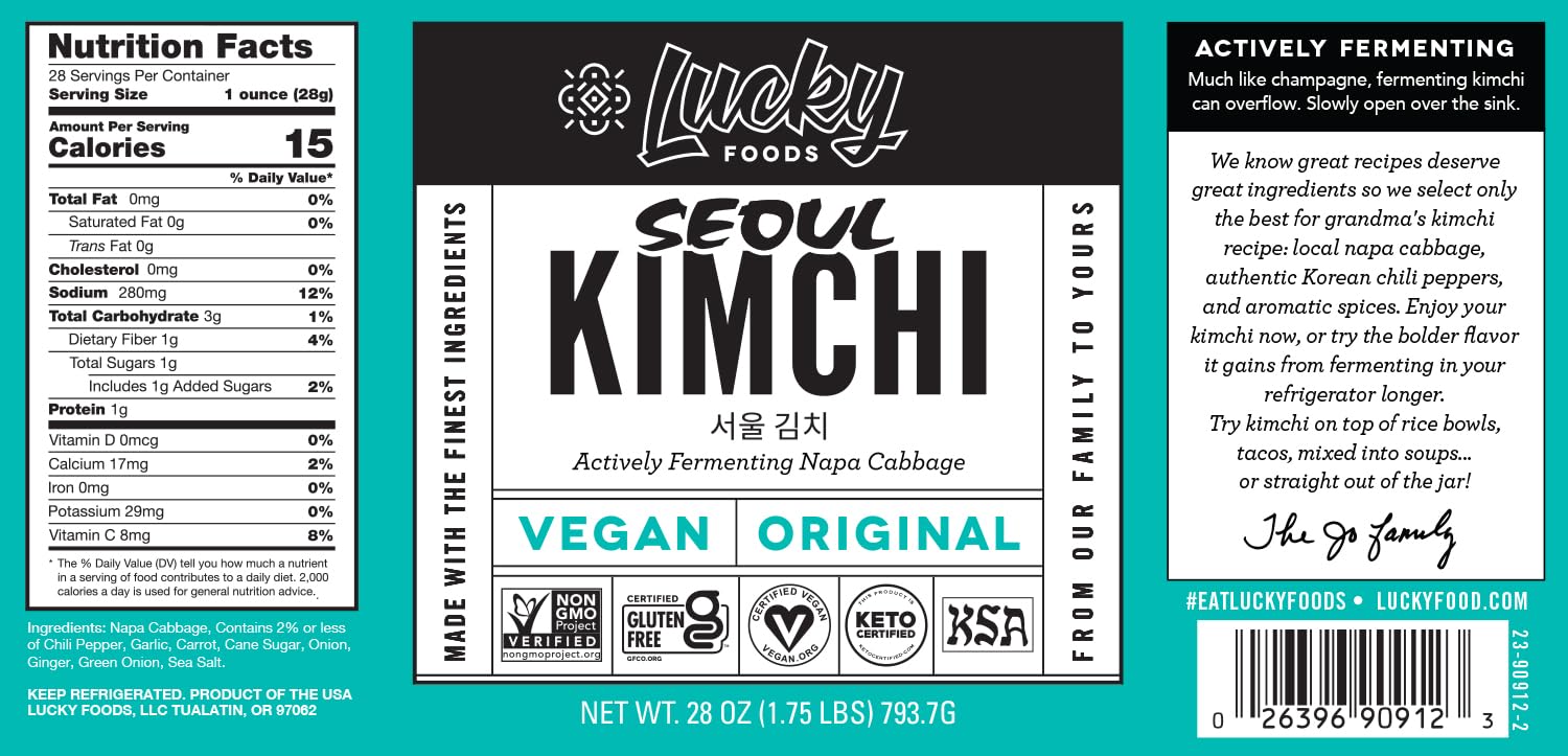 Q: What makes Lucky Foods Seoul Vegan Kimchi different from traditional kimchi?A: Lucky Foods Seoul Vegan Kimchi is crafted using our grandmother’s sacred recipe but with a vegan twist. It features high-quality napa cabbage, fresh vegetables, and authentic Gochugaru, making it a delicious and healthy alternative without animal products.