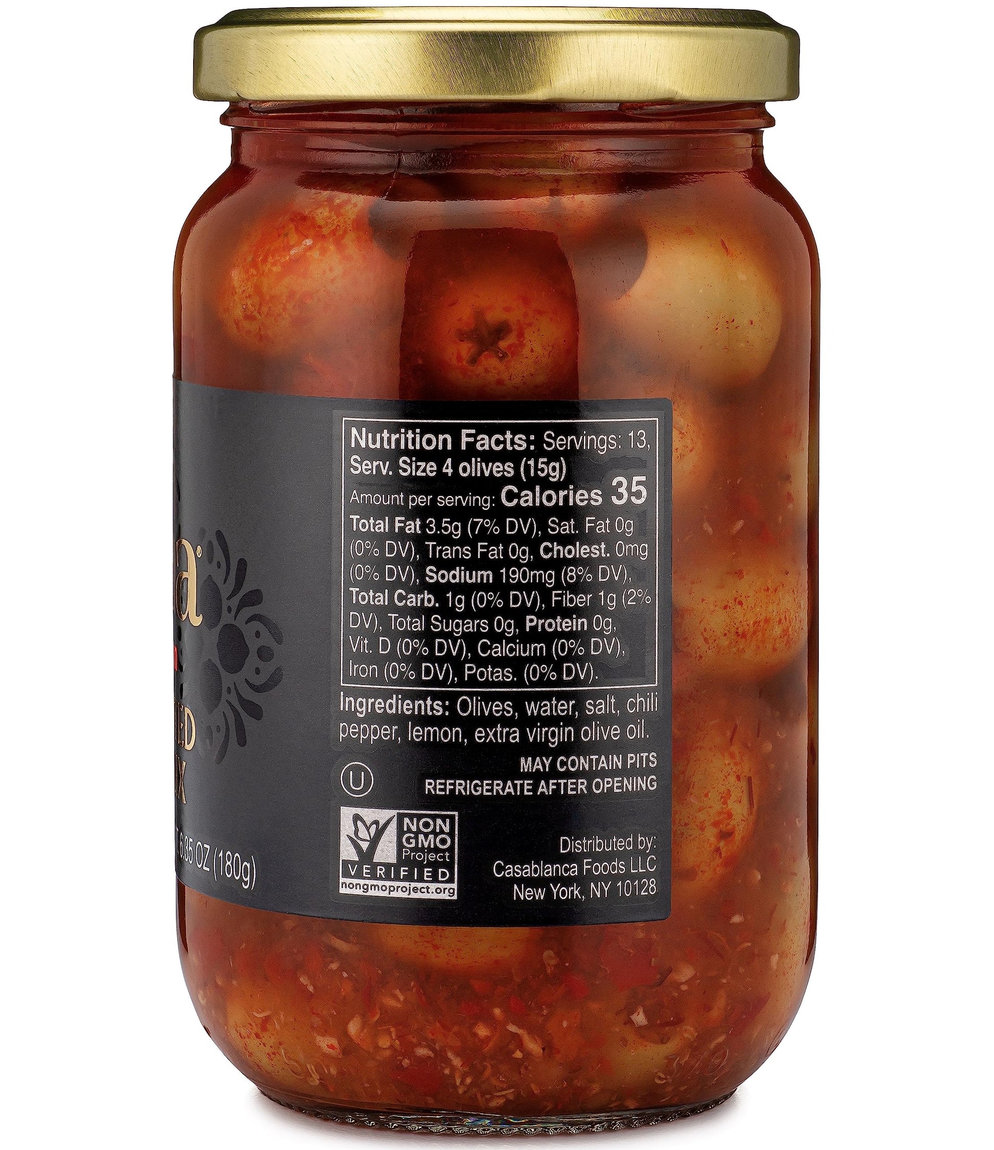 Mina Spicy Pitted Olive Mix, 12.5 Oz - Premium Handpicked Moroccan Olives With Red Chili Pepper Harissa, Keto Friendly Spicy Olives, Low Carb, Vegan, Gluten Free Healthy Snacks