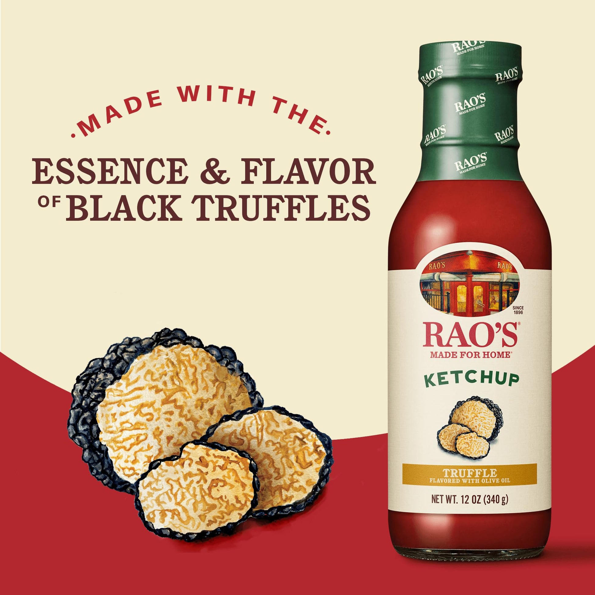 - Q: What size is the Rao’s Truffle Ketchup bottle? A: The Rao’s Truffle Flavored Tomato Ketchup comes in a 12-ounce bottle, providing ample quantity for various uses in your kitchen.