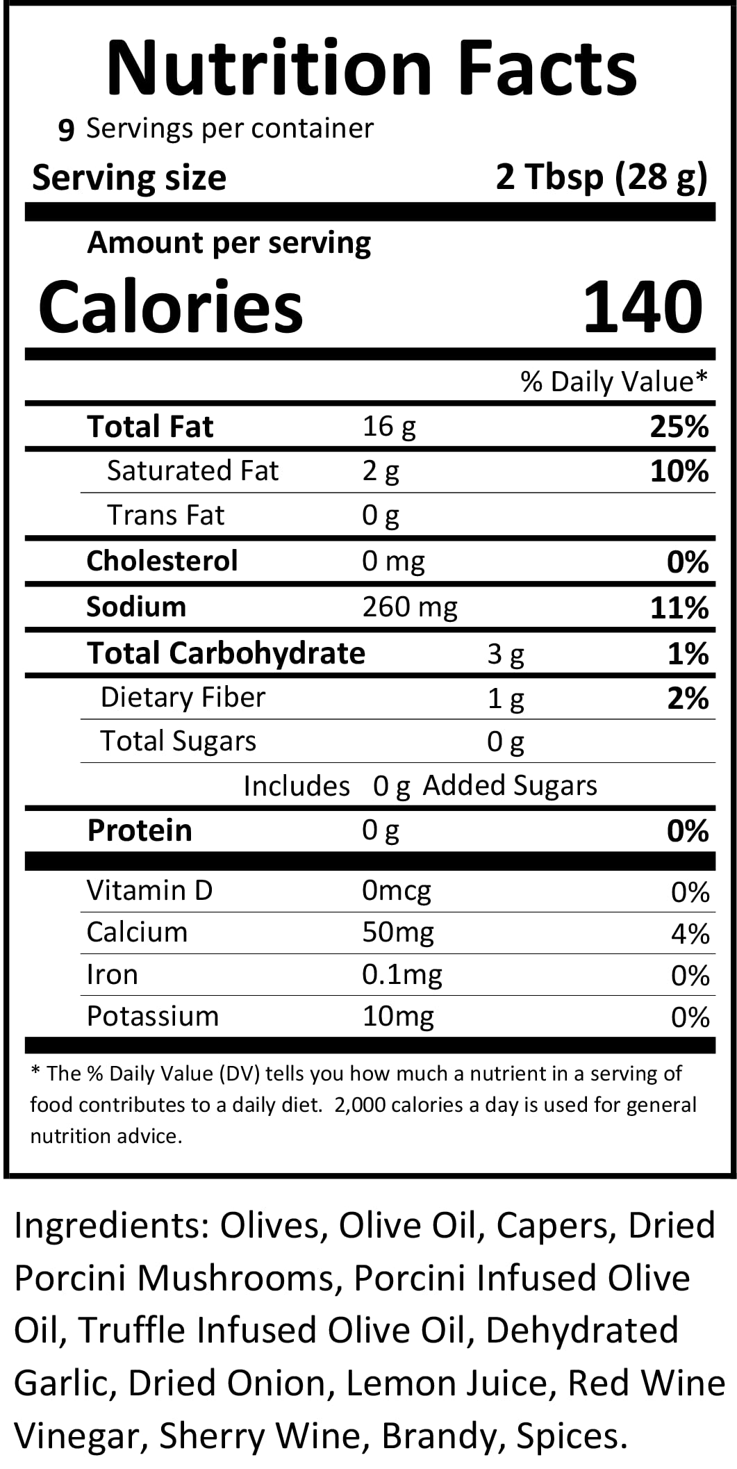 - Q: What is Sutter Buttes Olive Tapenade Spread and how can I use it? A: Sutter Buttes Olive Tapenade Spread is a savory blend of olives and porcini truffle, perfect for enhancing various dishes. You can enjoy it as an easy appetizer with crackers or warm bread, use it as a pizza sauce or topping, or stir it into warm or cold pasta. It also works great as a spread on chicken or fish, topped with Parmesan cheese.