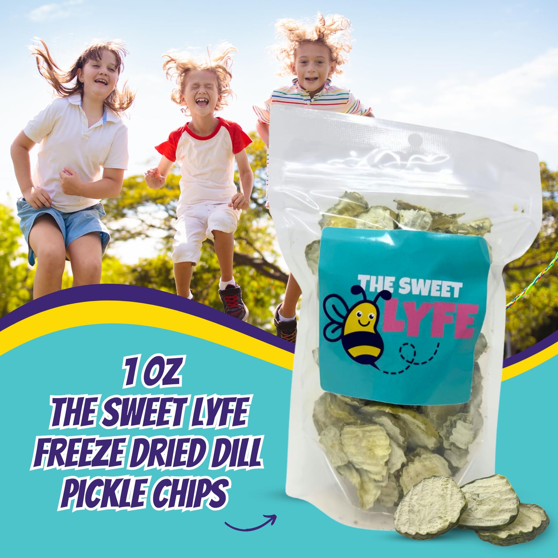 Q: What is the packaging size of these dill pickle chips?A: The Sweet Lyfe Freeze Dried Dill Pickle Chips come in a convenient 1 oz resealable pouch, making them easy to carry for on-the-go snacking.