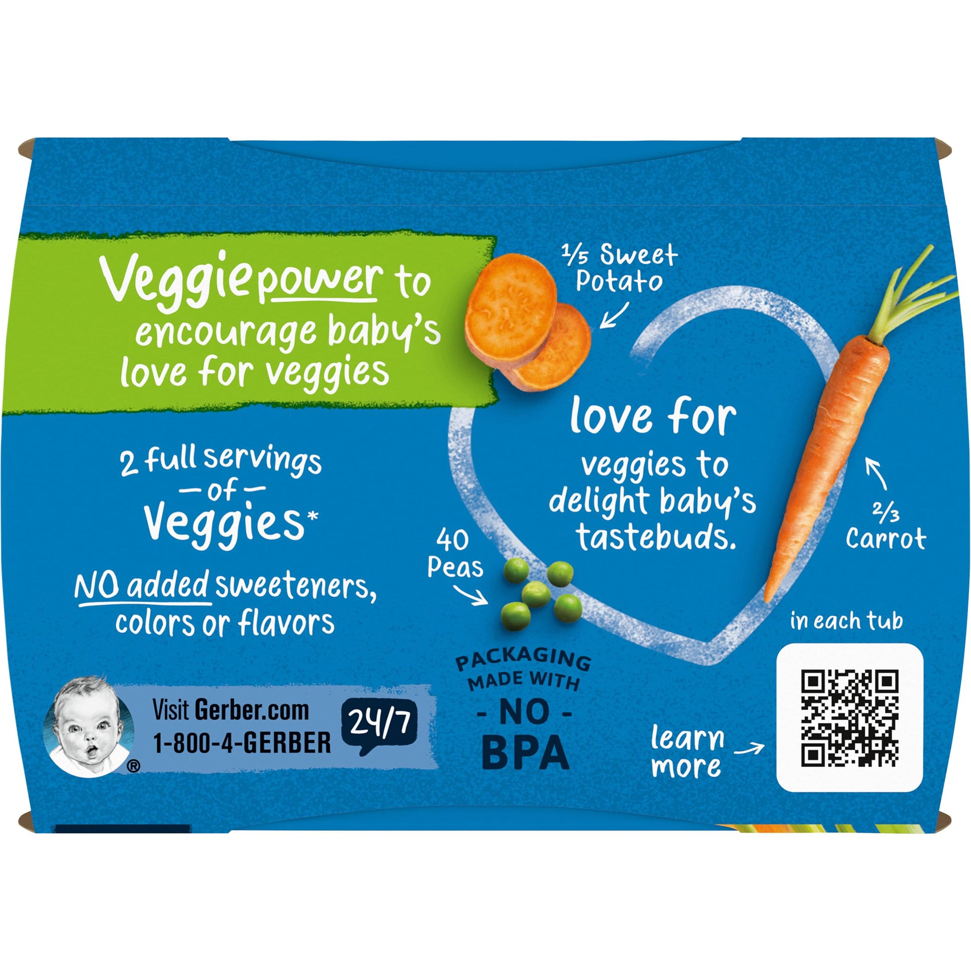 Gerber 2Nd Foods Carrot Sweet Potato Pea Baby Food Is A Delicious Vegetable Puree That Makes Feeding Time A Treat. All Our Recipes Are Made With Fruits And Veggies That Meet Gerbers High-Quality Standards. This Stage 2 Baby Food Recipe Includes 2/3 Carrot, 1/5 Sweet Potato And 40 Peas In Each Tub For A Yummy Combination Of Baby Food Vegetables. Packaged In A Bpa-Free Tub, This Unsweetened Baby Food Puree Provides 45 Percent Of Your Childs Recommended Daily Value For Vitamin C, And It Has No Artificial Colors Or Flavors. Gerber 2Nd Foods Help Expose Babies To A Variety Of Tastes And Ingredient Combinations, Which Is Essential To Help Them Accept New Flavors. Tuck These Convenient Tubs Into A Diaper Bag So You Can Easily Feed Your Sitter On The Go. You Can Feed Your Little One Straight From The Tub, Or Add Some To A Bowl And Refrigerate The Leftovers For Up To Two Days.