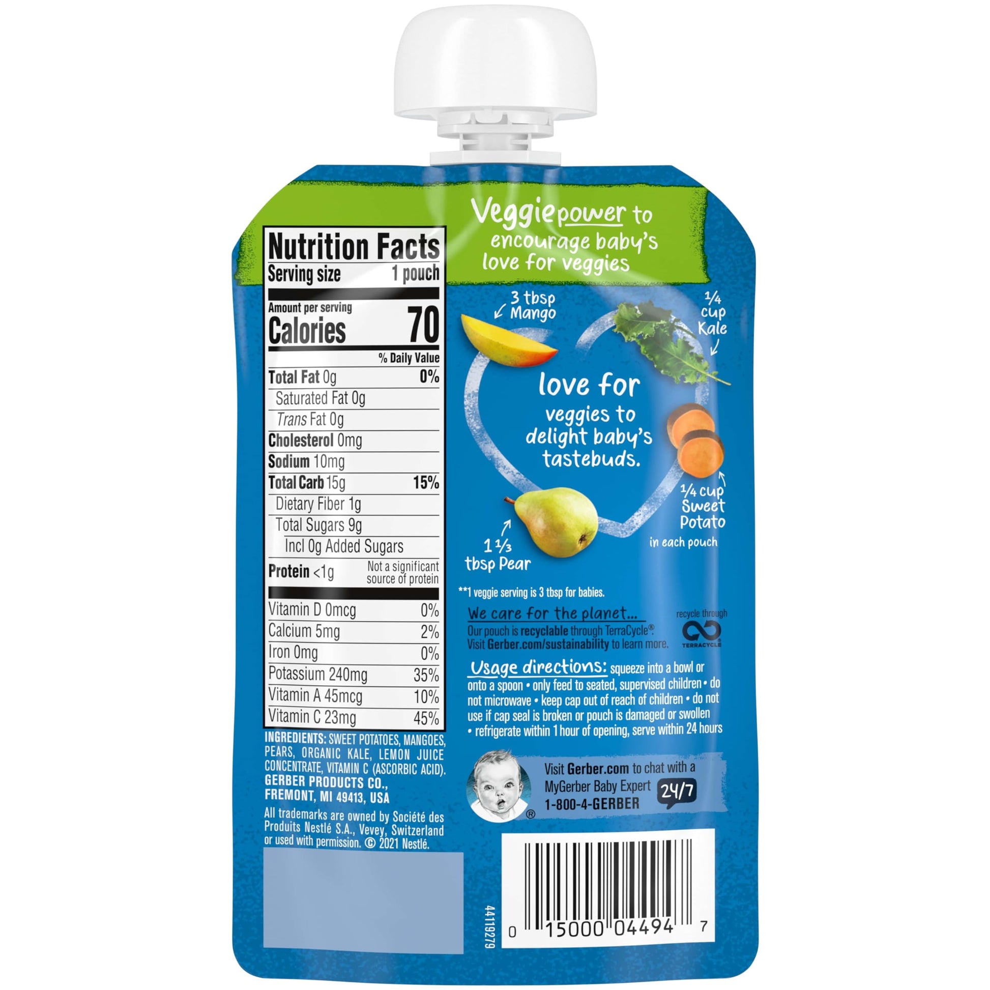 Q: What ingredients are in Gerber Baby Food Pouches, Veggie Power?A: Gerber Baby Food Pouches, Veggie Power, contain a blend of 1/4 cup sweet potato, 3 tablespoons mango, 1-1/3 tablespoons pear, and 1/4 cup kale, providing a nutritious mix of fruits and vegetables.