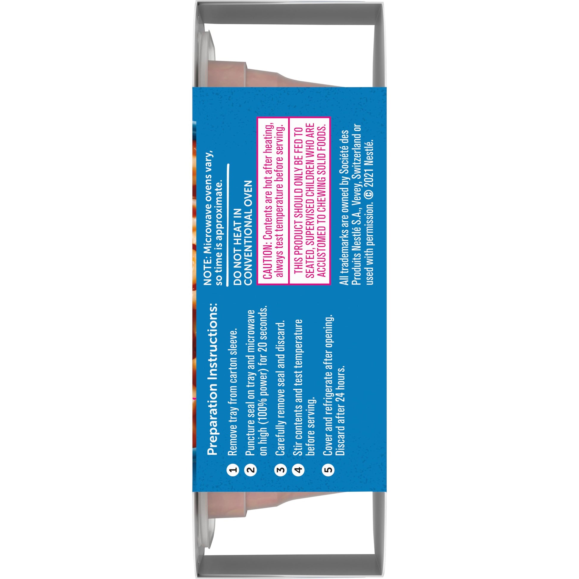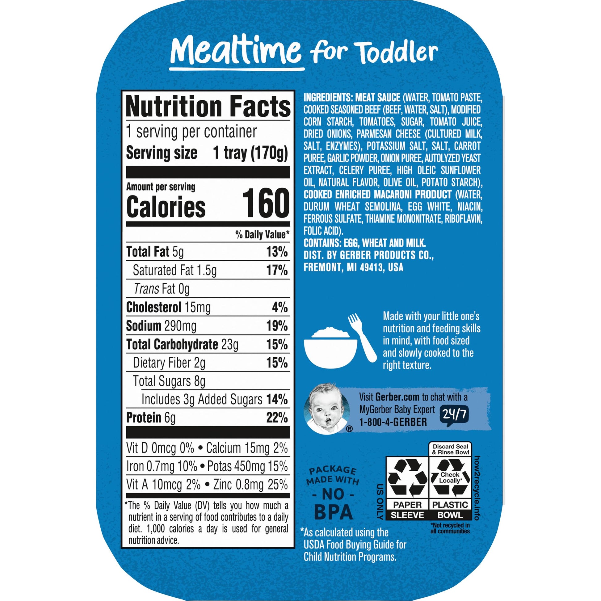 Offering wholesome nutrition with none of the hassle, Gerber Lil Meals Spaghetti Rings in Meat Sauce are delicious and convenient. Soft Gerber pasta in meat sauce contains 1/4 cup of farm-grown veggies for a delicious and nutritious option. This Gerber toddler food contains 6 grams of protein and is a good source of vitamin A, iron and zinc. Gerber spaghetti and meat sauce pieces are easy to pick up and chew to help your toddler master self-feeding. Slow-cooked and sealed to eliminate the need for preservatives, these Gerber toddler meals dont require refrigeration for convenient storage. Simply heat this Gerber baby food in the microwave. Cover and refrigerate leftovers and discard after 2 days.