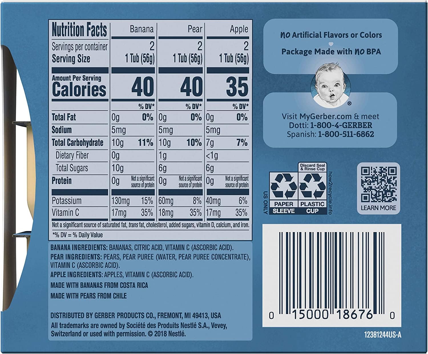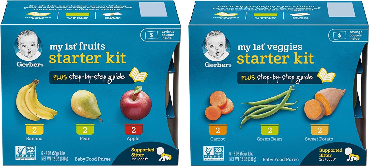 - Q: Are the ingredients in Gerber baby food organic or non-GMO? A: Yes, all the ingredients in the Gerber My First Fruits and Veggies Starter Kit are made with real, non-GMO ingredients and contain no artificial flavors, colors, or added sweeteners, ensuring a wholesome start to your baby's nutrition.