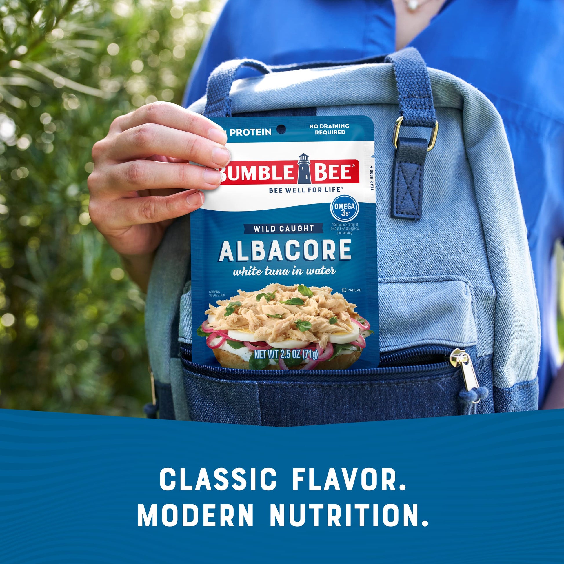 BUMBLE BEE Premium wild caught Solid White Albacore Tuna Pouch in water is the perfect post-workout snack or meal: on salads, lettuce wraps or sandwiches and a healthy food packed with protein, containing omega-3 unsaturated fatty acids, vitamin B6 and niacin, as well as important minerals like iron and selenium. BUMBLE BEE Tuna is the perfect choice for all your tuna recipes and is a reliable keto food and keto snack for those on a ketogenic (keto) diet.Dedicated to SustainabilityAt BUMBLE BEE Seafoods, practicing sustainability is an organizational imperative. We’re a proud founder of the ISSF - an organization that works hard every day to ensure the responsible harvesting and management of the seafood we provide to our consumers and promote global sustainable tuna fisheries.About Bumble Bee SeafoodsBUMBLE BEE Seafoods was founded in 1899 by a handful of dedicated fishermen. Today, privately held and headquartered in the United States, BUMBLE BEE Seafoods is North America’s largest branded shelf-stable seafood company, offering a full line of canned and pouched tuna, salmon, sardines, and specialty seafood products marketed in the U.S. under leading brands including BUMBLE BEE, BRUNSWICK, SNOW'S, BEACH CLIFF, WILD SELECTIONS, and in Canada under the CLOVER LEAF brand. The BUMBLE BEE brand has established significant consumer awareness and loyalty based on the quality, nutritional value, and affordability of its products.