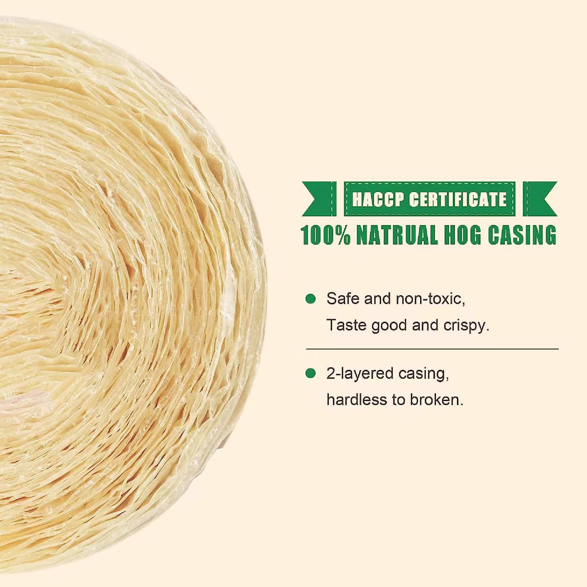 Q: What is the size of the edible sausage casing?A: The edible sausage casing comes in a length of 8 meters (26 feet) and has a diameter of 32mm (approximately 1 1/4 inches), making it suitable for various sausage types.