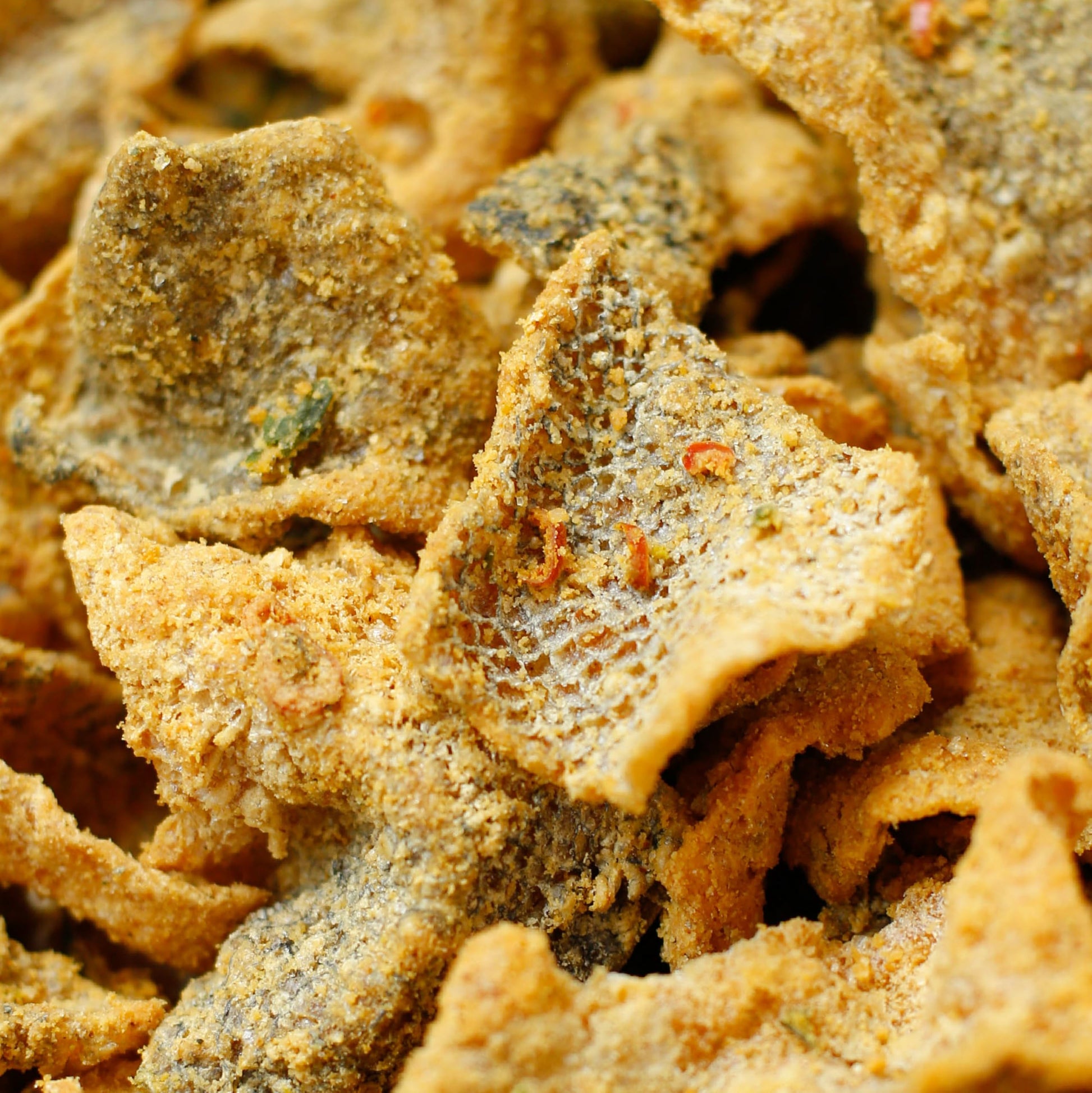 Q: What are IRVINS Salted Egg Salmon Skin Chips made of?A: IRVINS Salted Egg Salmon Skin Chips are made from upcycled salmon skin, real salted duck egg yolks, aromatic curry leaves, and birds eye chili pepper, creating a unique and delicious snacking experience.