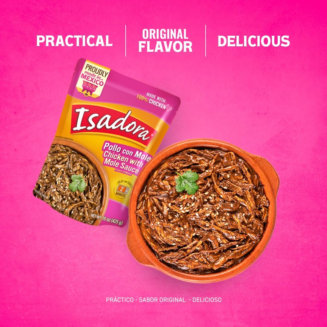 - Q: Is Isadora Pollo con Mole made with real chicken? A: Yes, Isadora Fully Cooked Pollo con Mole is made with 100% high-quality chicken, ensuring a flavorful and tender meal.