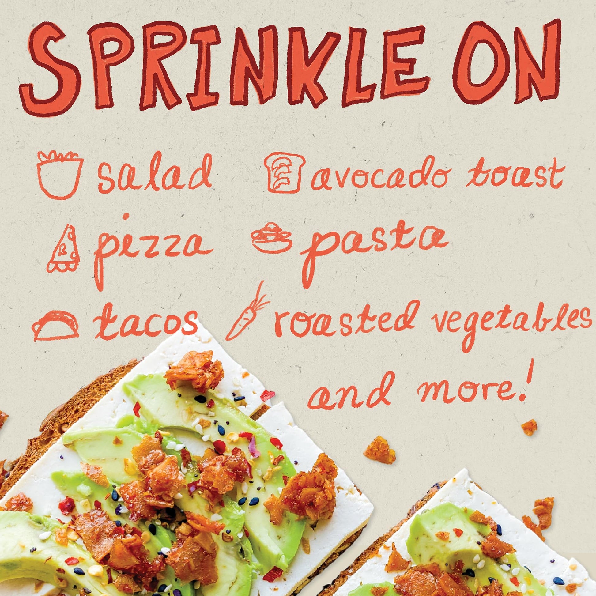 Q: How can I use Plant-Based Bacon Bits in my meals?A: These bacon bits are versatile and can be used as a topping for salads, avocado toasts, roasted vegetables, breakfast dishes, sandwiches, burgers, and even pasta. They add a delicious crunch and smoky flavor to a variety of meals.