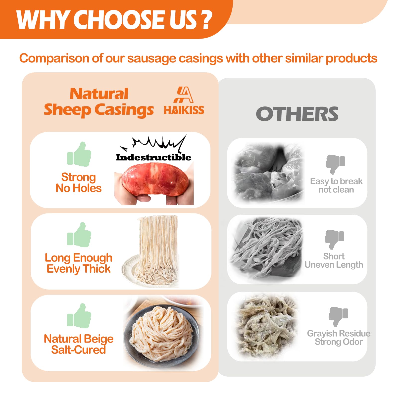 Q: What should I do if I'm not satisfied with the product?A: If you are not completely satisfied with the Natural Sheep Sausage Casing, please feel free to contact us. We value customer feedback and offer a money-back guarantee to ensure your satisfaction.