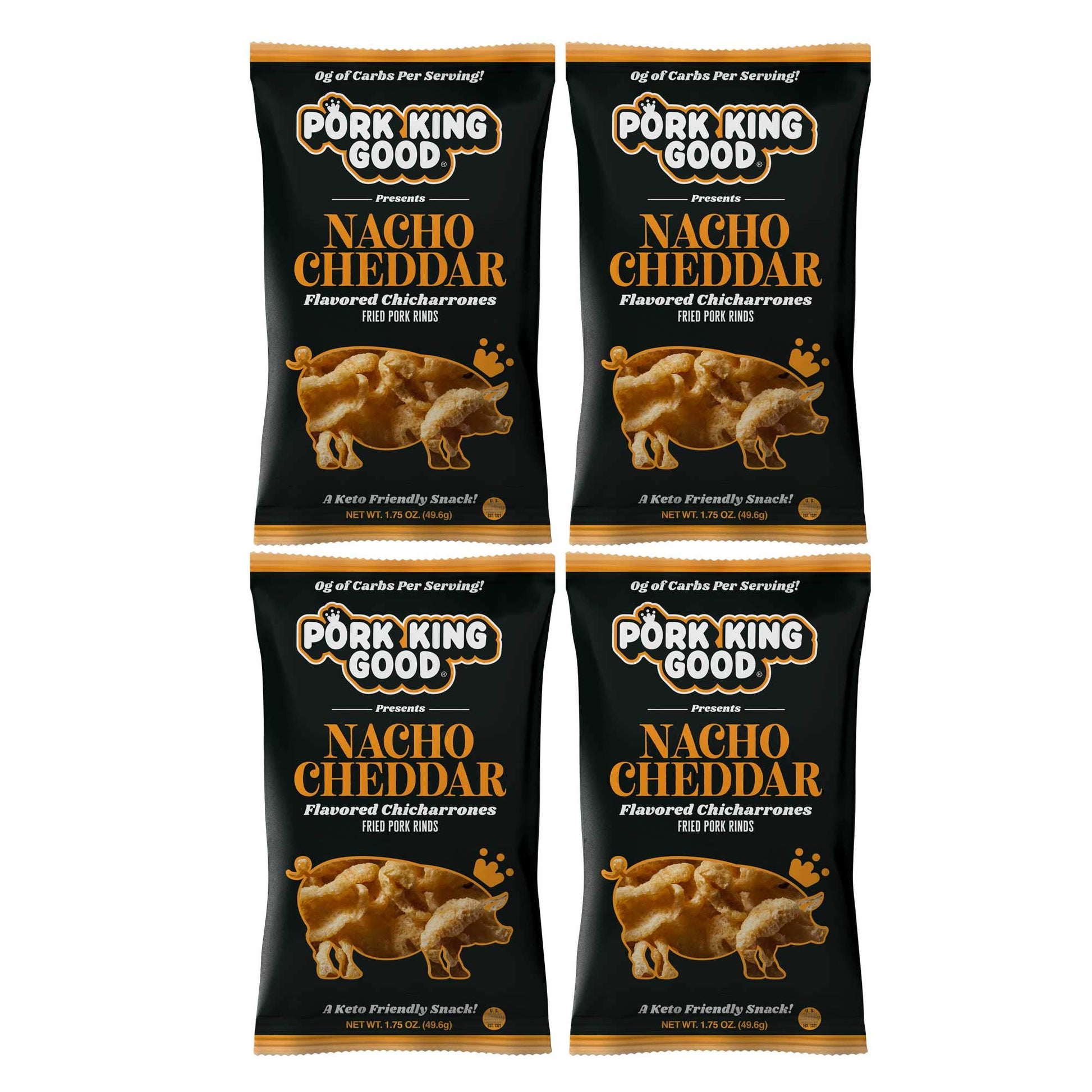 - Q: What is the packaging size of Pork King Good Nacho Cheddar Pork Rinds? A: The product comes in a convenient 4 pack, with each bag containing 1.75 ounces of crunchy nacho cheddar pork rinds, ideal for snacking at home, school, or work.