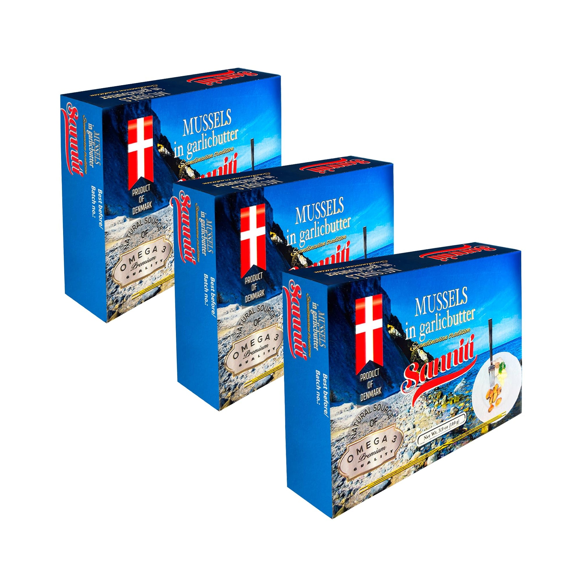 Q: What are Sanniti Mussels in Garlic Butter made of?A: Sanniti Mussels in Garlic Butter are made from high-quality mussels sourced from Denmark, infused with a rich and savory garlic butter sauce, creating a flavorful seafood experience.
