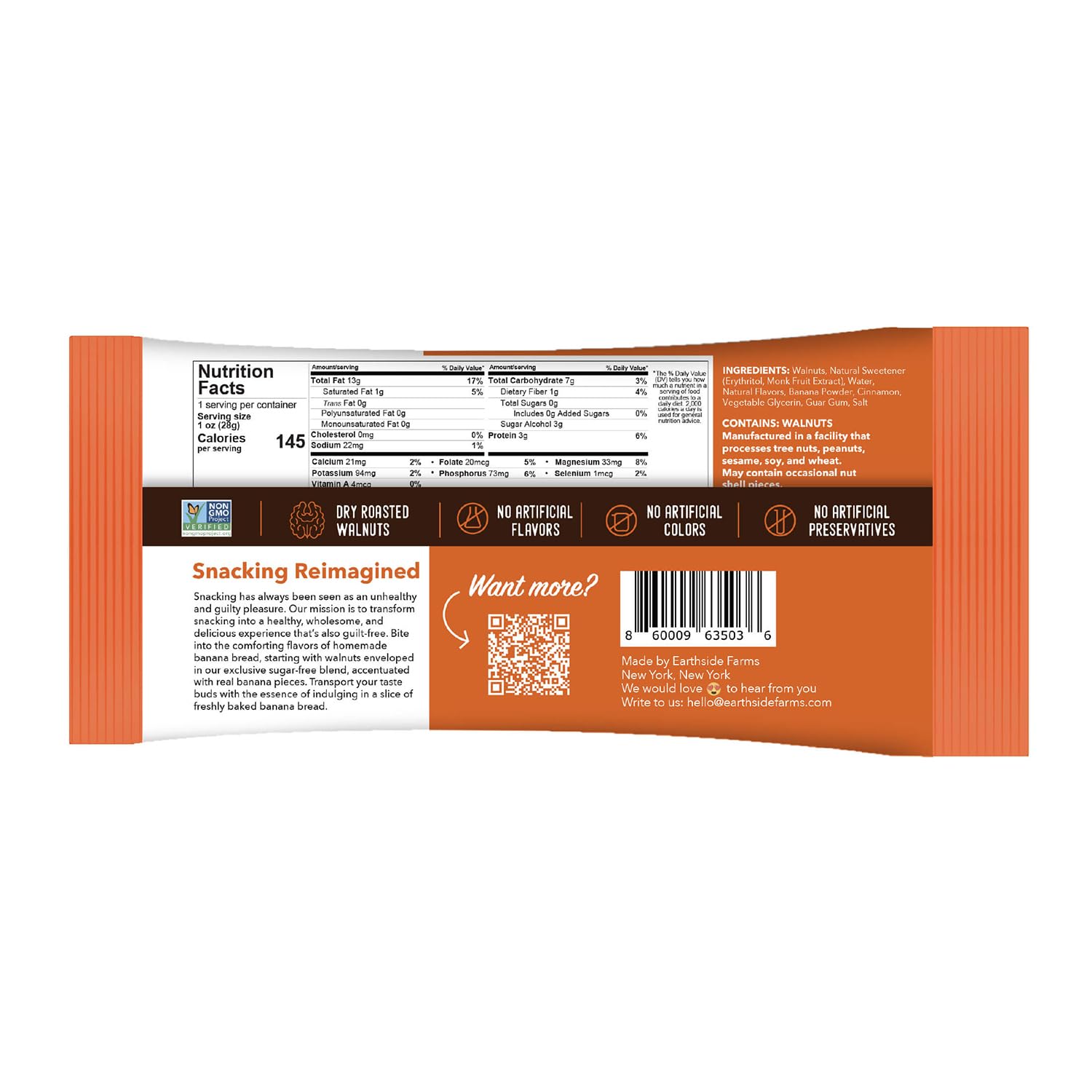 Q: What is the serving size for Earthside Farms Banana Bread Walnuts?A: Each individual pack of Earthside Farms Banana Bread Walnuts contains 1 ounce, making it a convenient on-the-go snack option that is easy to portion.