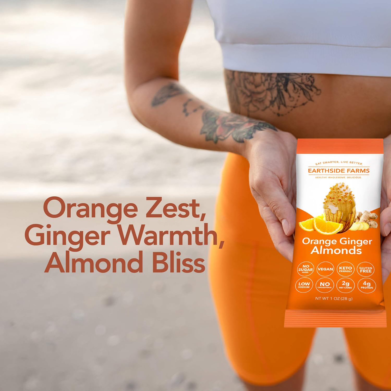 Q: What makes Earthside Farms snacks a healthier option?A: Earthside Farms snacks, including Orange Ginger Almonds, are made with natural ingredients, low sugar, and packed with plant protein, making them a nutritious alternative to traditional snacks.