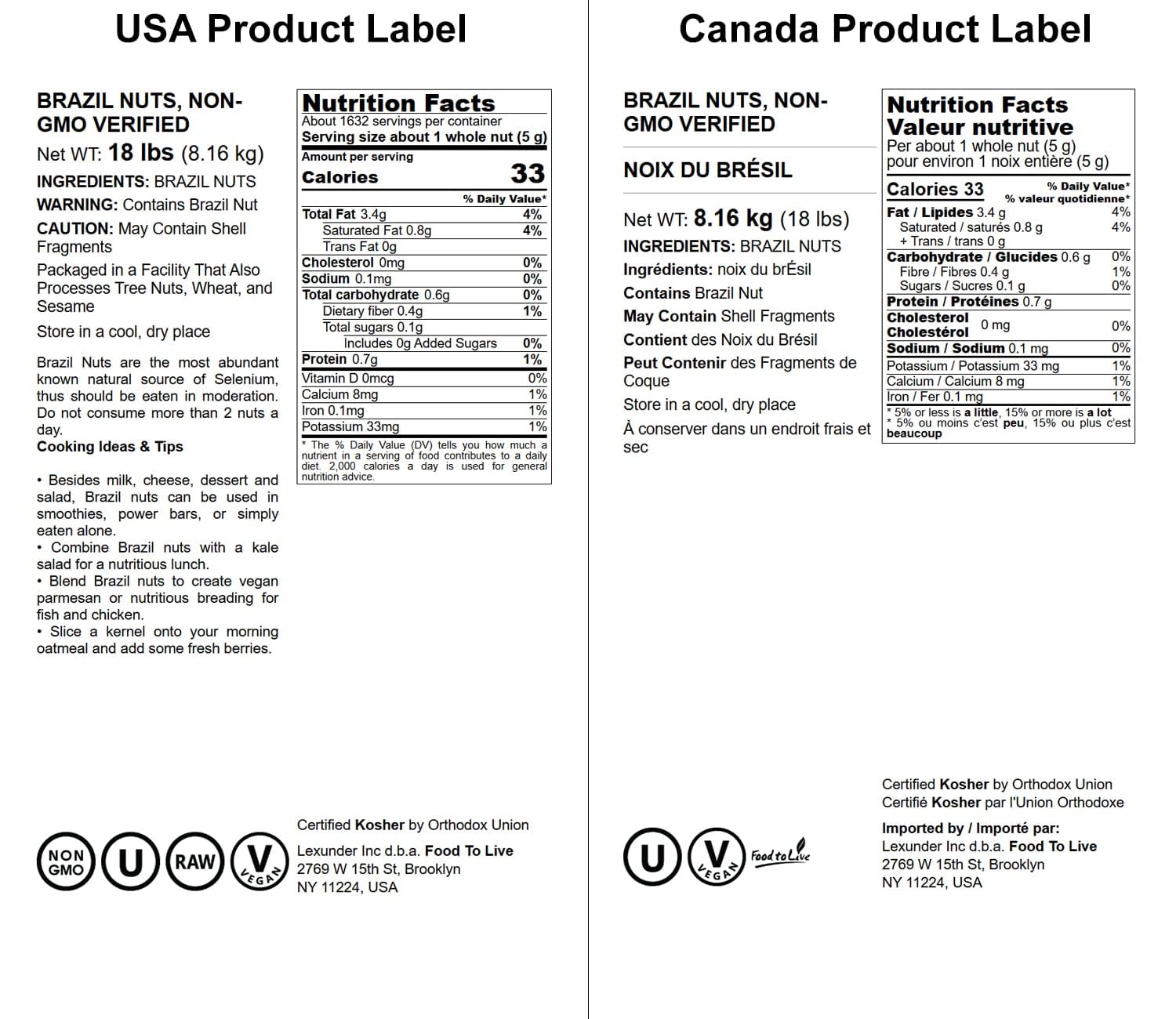 Brazil nuts are full of flavor and nutrients. You can snack on them raw at any time, even if you are on a diet. These delicious nuts are packed with dietary fiber and proteins. Nutritional Value Our Brazil nuts are of the highest quality and full of essential nutrients, such as vitamin E, copper, and magnesium. They are also the best source of selenium, one of the most potent natural antioxidants. 3-4 nuts are enough to meet your daily requirement of this precious mineral. Directions Food to Live Whole Brazil Nuts can be eaten raw, sprinkled over fruit or vegetable salads, and added to soups and vegetable dishes. They taste exceptionally well in desserts and confections. This product is processed in a facility that also processes wheat. WARNING: Contains Tree Nuts!