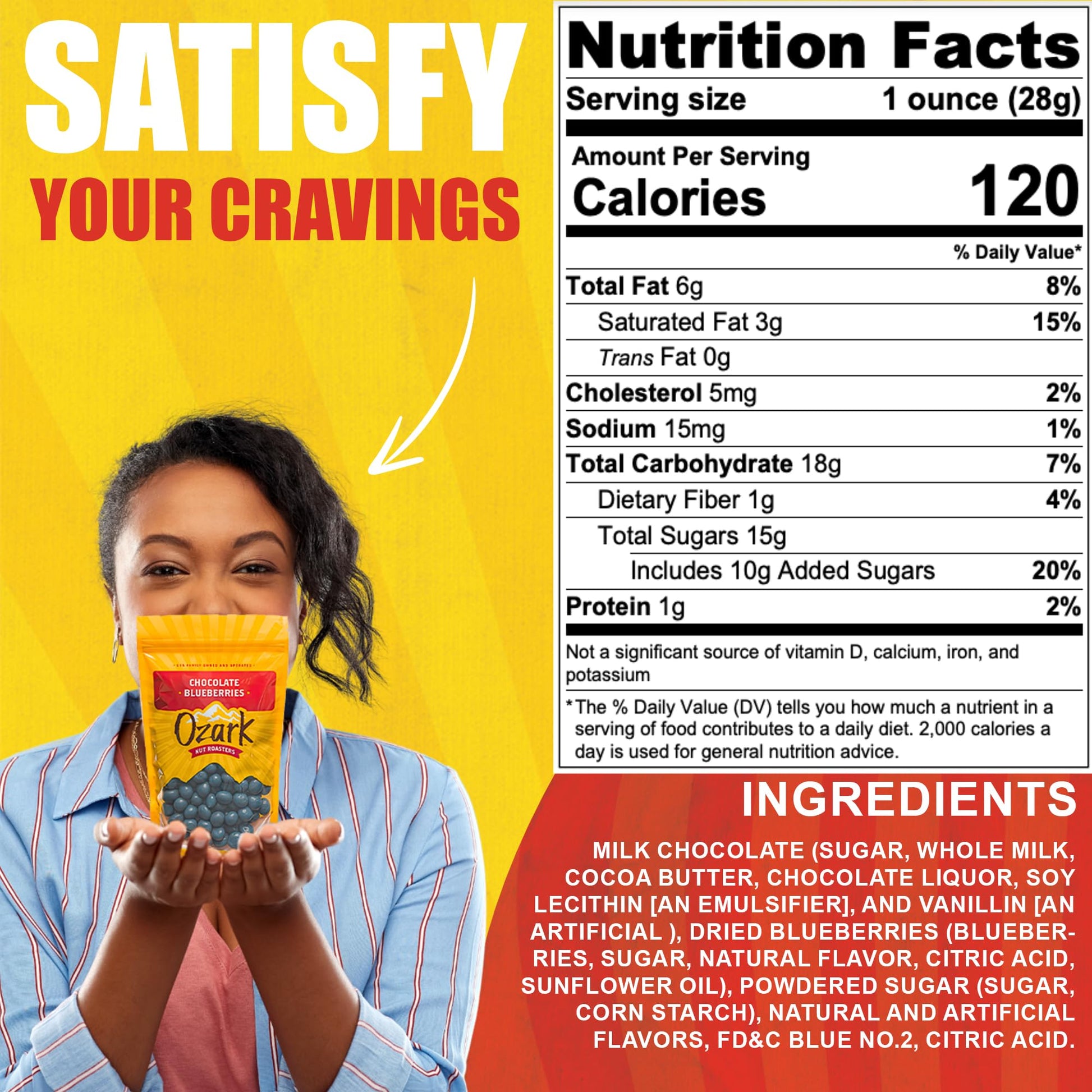 - Q: Are Ozark Nuts' Chocolate Covered Blueberries suitable for on-the-go snacking? A: Yes, the convenient 4 oz portable pouch is designed for easy grab-and-go snacking. Whether you’re at work, traveling, or enjoying outdoor activities, these chocolate-covered blueberries make a perfect snack option.