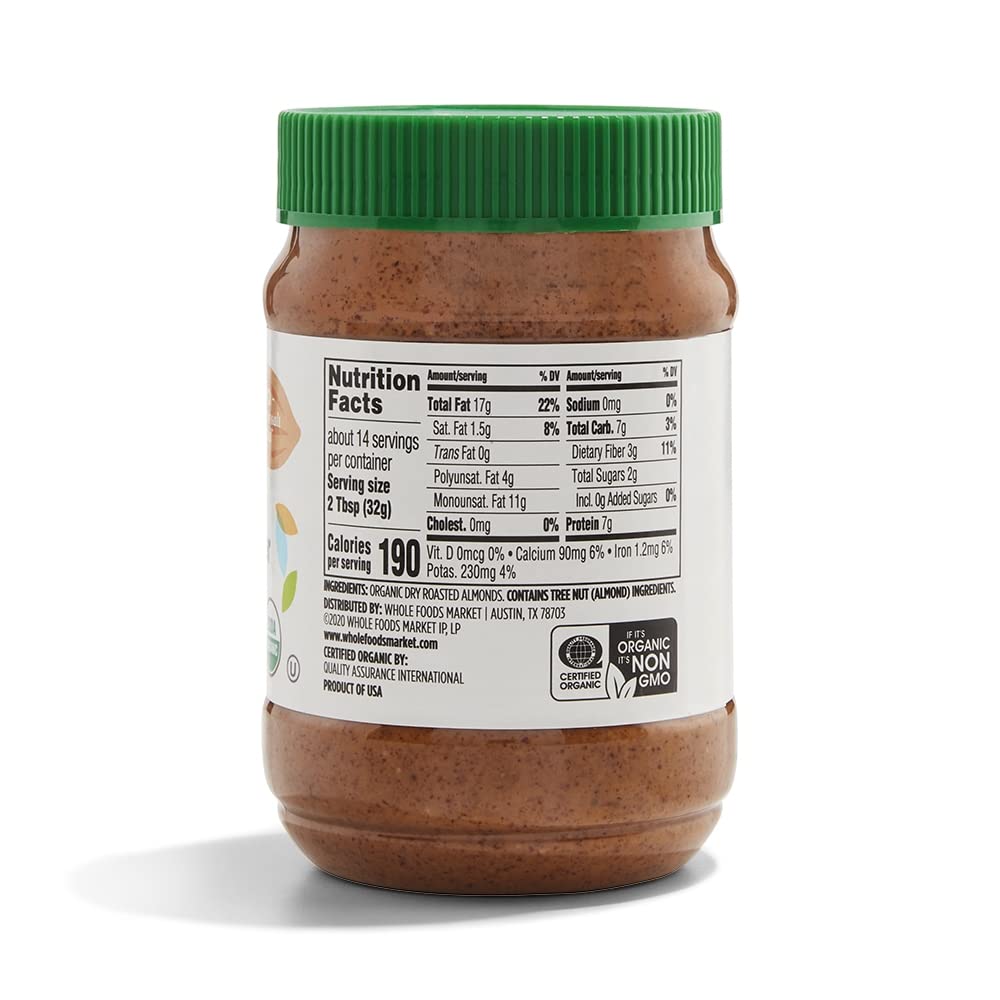 Q: Does this almond butter contain any added sugars or salts?A: No, 365 by Whole Foods Market Organic Creamy Almond Butter is made without any added sugars or salts, making it a healthier choice for your pantry.