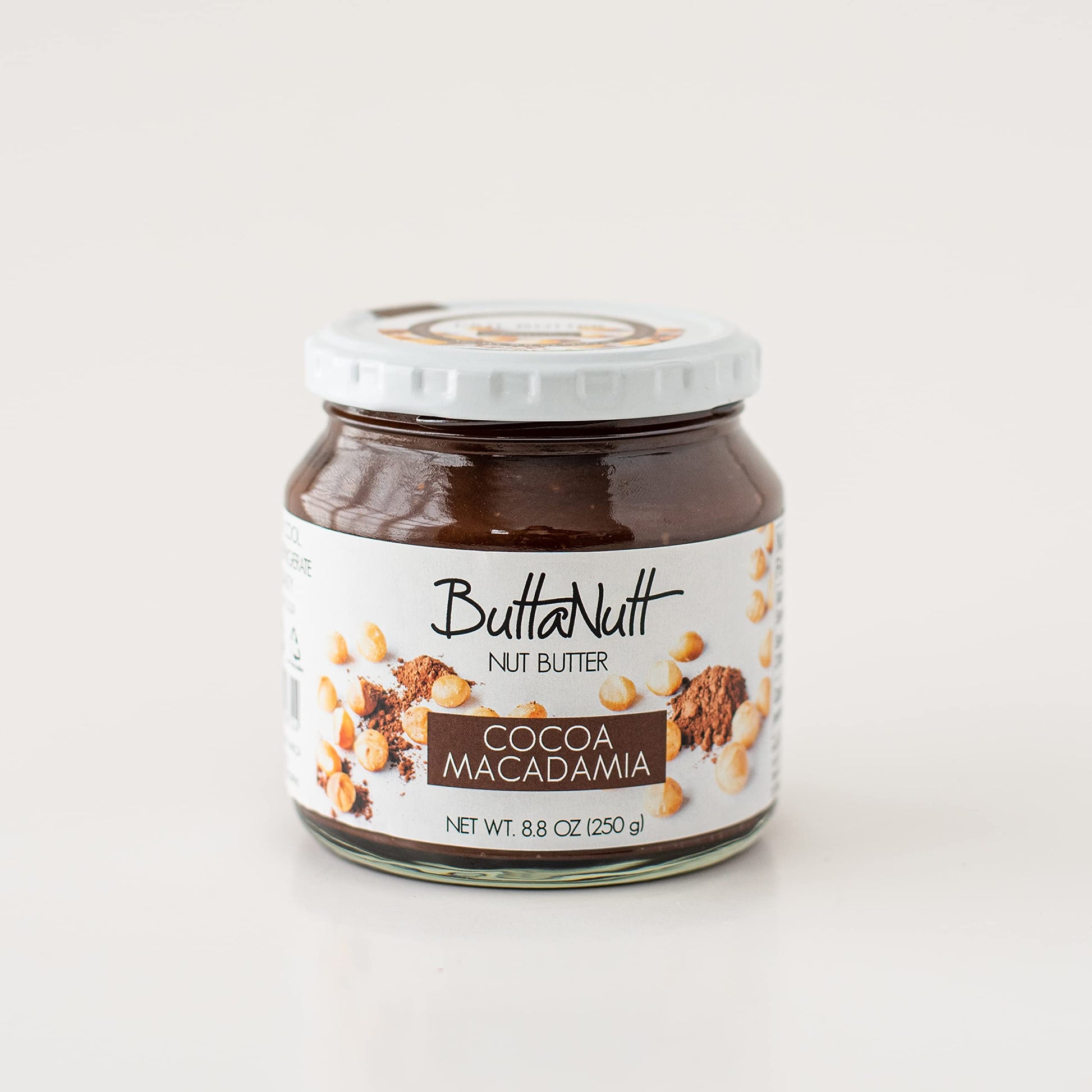 - Q: What is the size of the ButtaNutt Cocoa Macadamia Nut Butter jar? A: The ButtaNutt Cocoa Macadamia Nut Butter comes in an eight point eight ounce jar, which is a convenient size for home use.