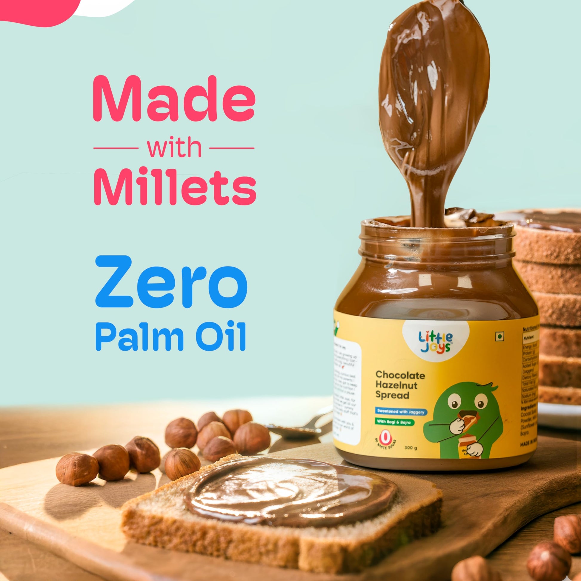 Little Joys Chocolate Spread | Date-Sweetened | No Refined Sugar, No Palm Oil, No Preservatives | Hazelnut, Cocoa & Multi-Millets | 10.58 oz Switch from sugary chocolate spreads to a wholesome alternative your kids will love. Little Joys Chocolate Spread is crafted with rich hazelnut and cocoa, blended with the goodness of multi-millets (ragi and bajra) to make every bite both delicious and nutritious. Unlike regular spreads loaded with refined sugar, ours is naturally sweetened with dates, offering a healthier option for growing children. With no preservatives, no palm oil, no artificial colors, and no added chemicals, this spread is as honest as it is indulgent. Perfect for busy mornings, lunchboxes, or guilt-free snacks-spread it on bread, pancakes, or dosas, or use it as a dip for fruits and sticks. Nutritious and tasty, its a chocolate spread that parents can trust and kids can enjoy without compromise. What Makes It Different Sweetened with Dates - Absolutely no white or refined sugar of any kind. Power of Multi-Millets - Ragi and bajra help support immunity and overall growth. Clean & Honest - No palm oil, no preservatives, no artificial colors, and no chemicals. Nutritious & Delicious - A rich blend of hazelnut and cocoa for a creamy, chocolatey taste kids love. Versatile Everyday Use - Spread on bread, pancakes, rotis, or use as a dip for fruits and snacks. Little Joys Chocolate Spread combines taste and health in every spoonful, making it the smarter choice for parents and the tastier one for kids.