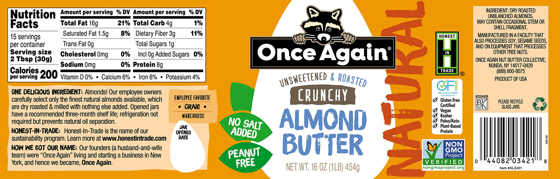- Q: What makes Once Again Nut Butter Almond Crunch different from other almond butters? A: Once Again Nut Butter Almond Crunch stands out due to its commitment to quality; it is made from ethically sourced almonds from Italy, Spain, and California, and it contains no added sugars or preservatives, ensuring a natural and crunchy experience.