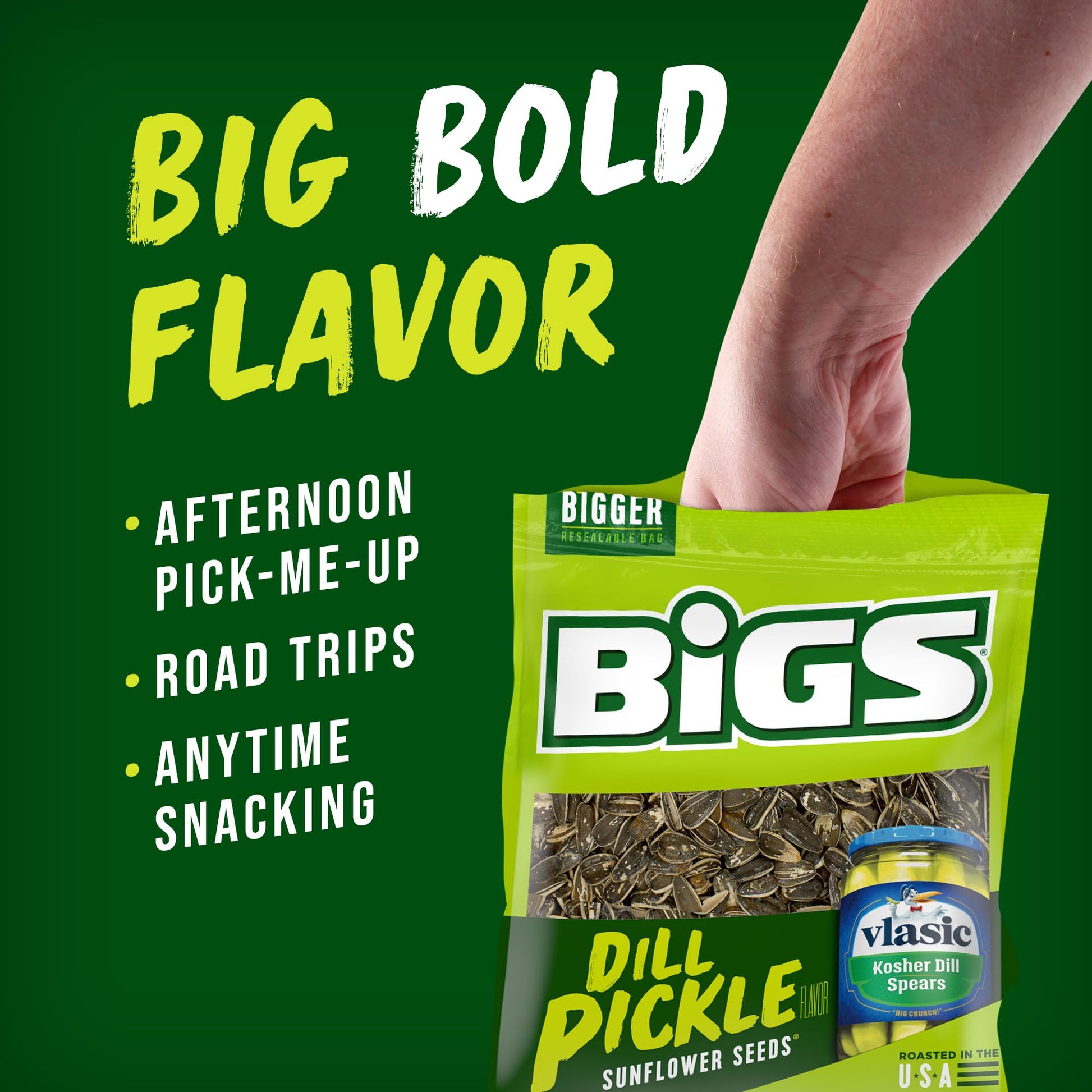 - Q: What makes BIGS Vlasic Dill Pickle Flavored Sunflower Seeds different from regular sunflower seeds? A: BIGS Vlasic Dill Pickle Flavored Sunflower Seeds stand out due to their unique dill pickle flavor, created in partnership with Vlasic, known for their pickles. This bold flavor adds a tangy twist to the traditional sunflower seed snacking experience.