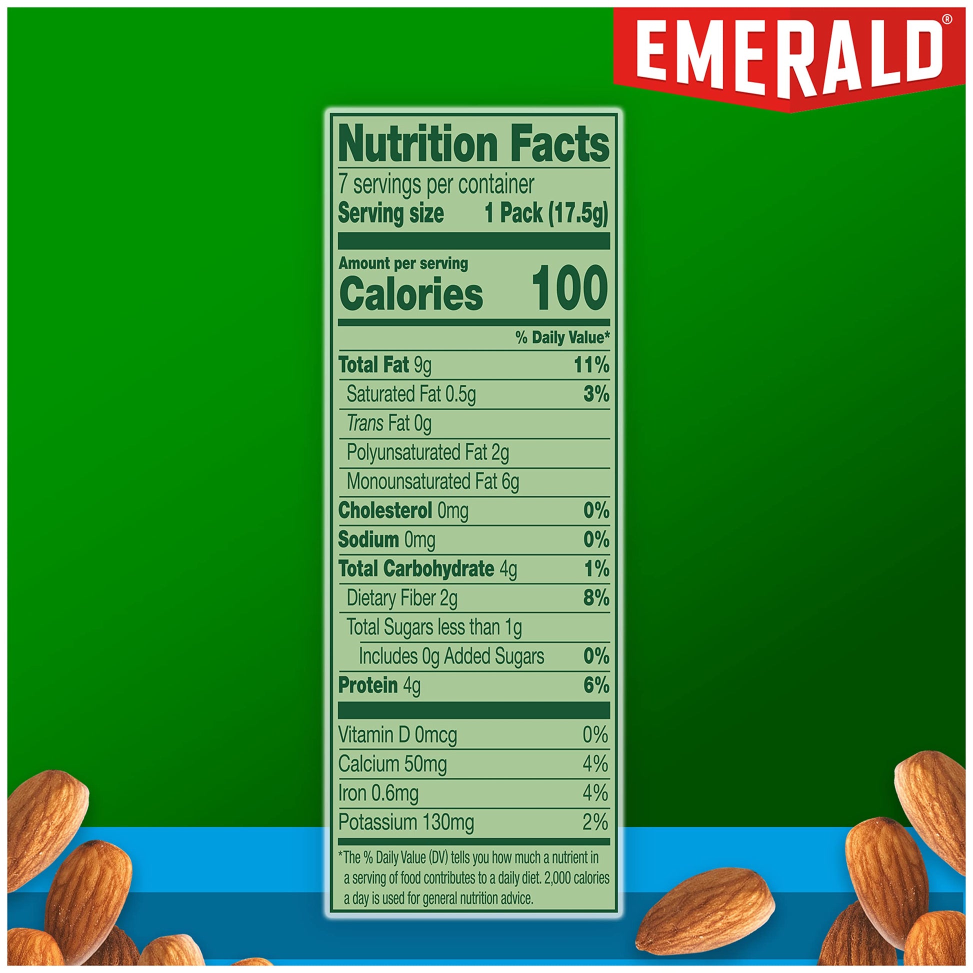 At Emerald, were nuts about providing you with high-quality and delicious nuts. Almonds are a satisfying go-to snack to keep hunger away. These nuts are packed just as they are, with no salt added. And because you dont always have time to stop for a satisfying snack, our 100-calorie packs are great for your on-the-go lifestyle. Emerald harvests only the tastiest, crunchiest, high-quality nuts. Our secret is in our distinct crunch that each nut provides. Whatever the occasion, Emerald has the specific nut you are looking for. With no artificial preservatives, colors, or flavors, no gluten, and no GMOs, it's a snack you'll feel good about! And each 100-calorie pack has 4g of protein to help fuel your active day. So when you want a better-for-you snack to satisfy your craving, you can count on Emerald Nuts.