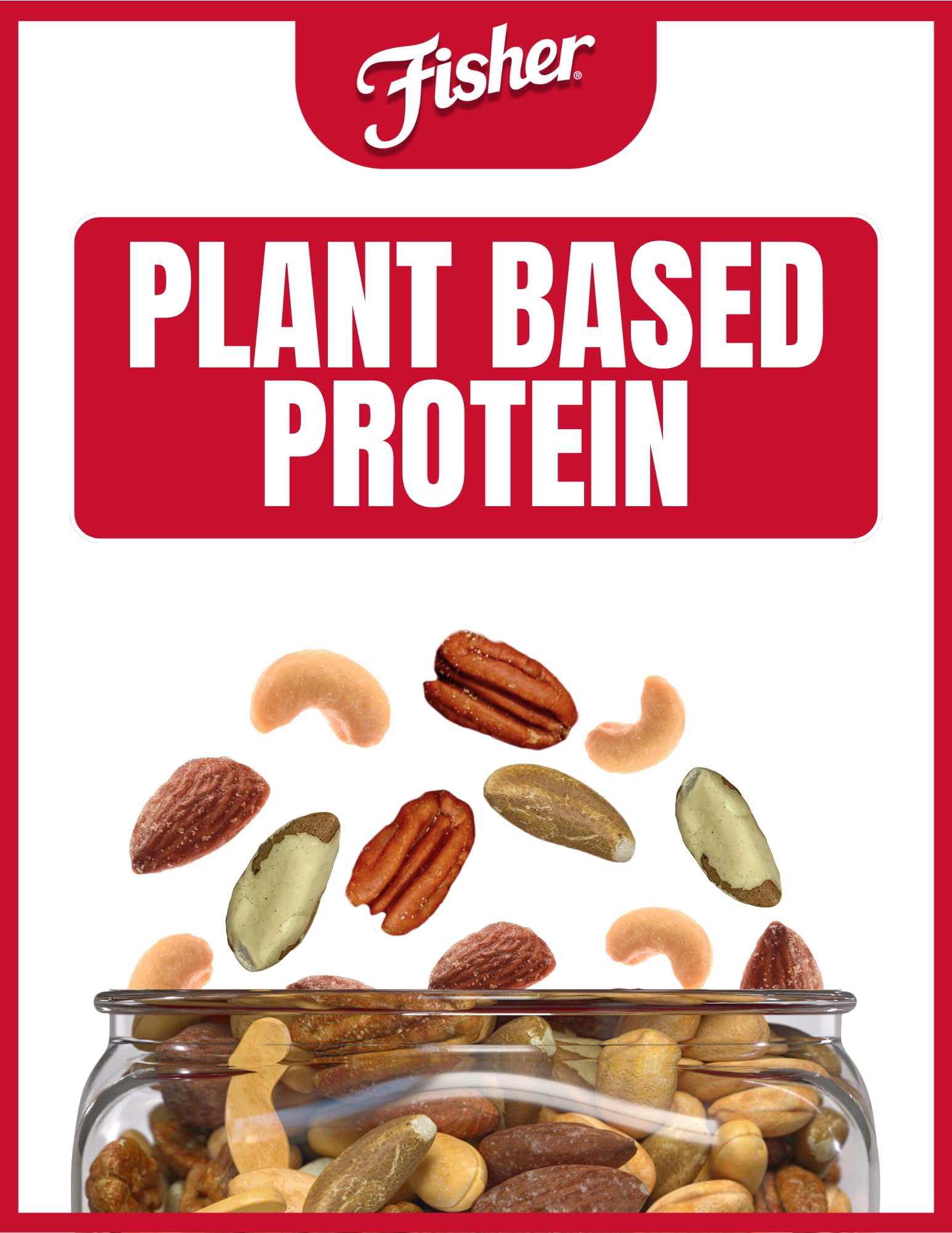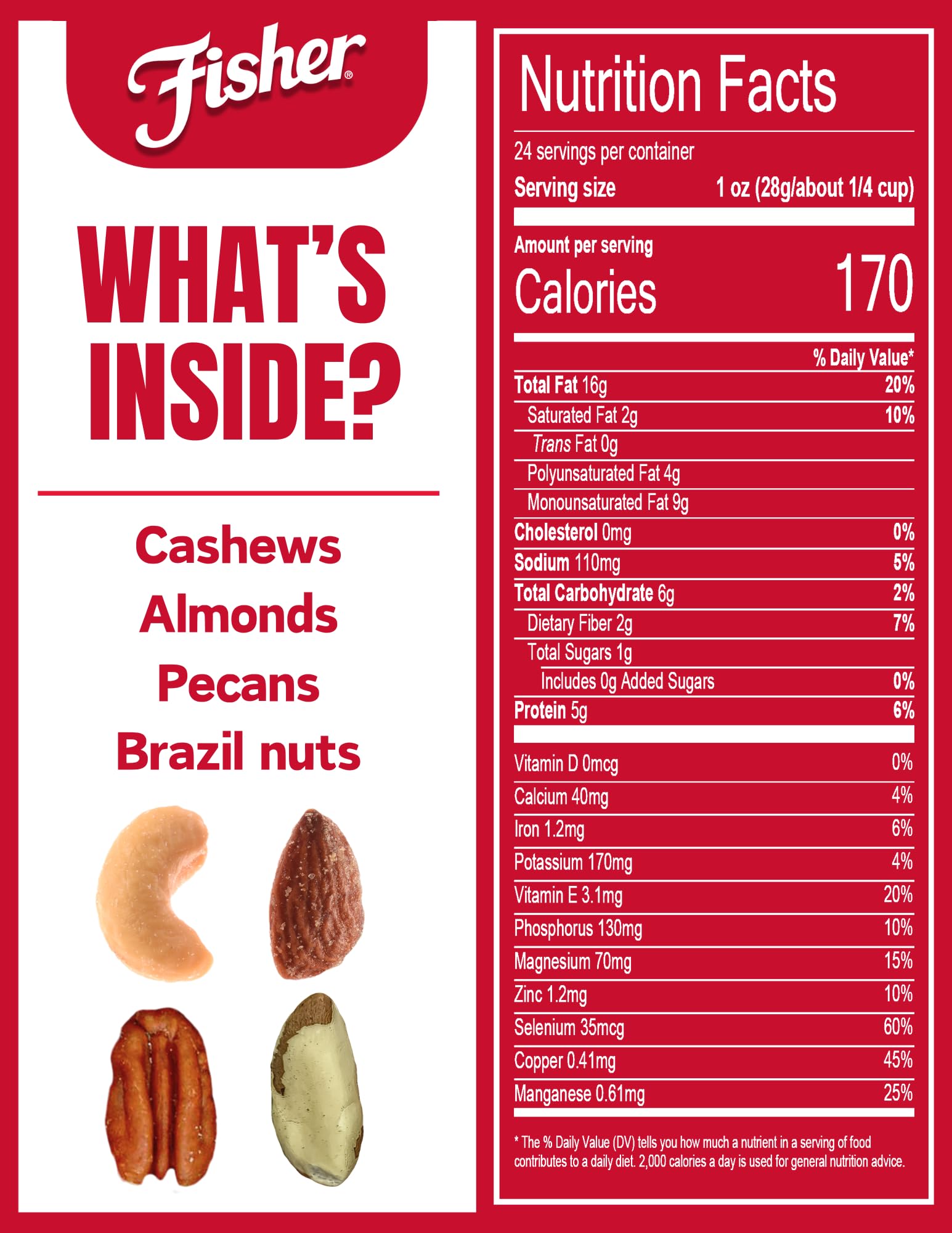 You can find all of your favorite nuts right here in Fisher Snack Deluxe Mixed Nuts. Sorry peanuts, you're out. It's all the nuts you love and no picking around the peanuts anymore. Our classic, clear jar highlights the unsurpassed quality of Fisher Nuts which are sourced directly from farmers, many of whom we've worked with for generations. Not to mention, our Mixed Nuts is a good source of 7 vitamins and minerals including selenium, copper, and manganese, as well as providing 5 grams of protein per serving. Fisher is your home for a complete assortment of snack nuts, nut mixes, trail mixes and salad toppings, as well as an extensive variety of baking and cooking nuts.