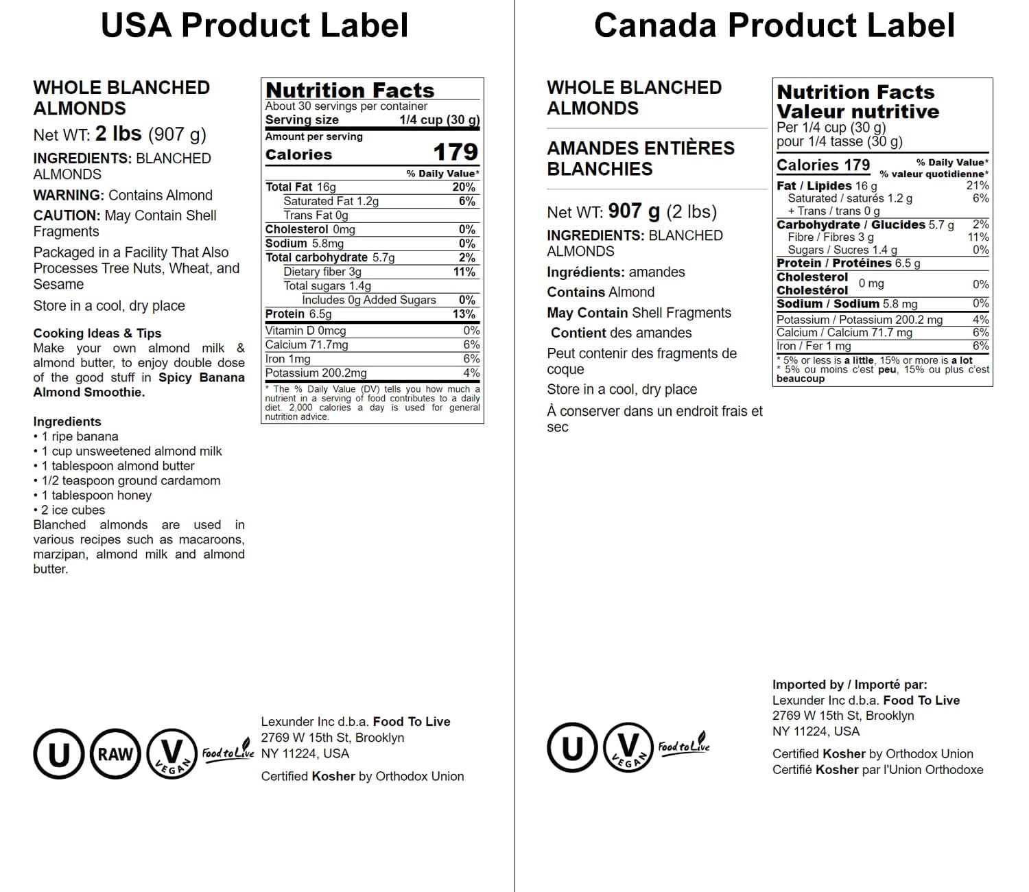 Q: Do these almonds contain any allergens?A: Yes, Food to Live Blanched Whole Almonds contain tree nuts. It is processed in a facility that also handles wheat, so individuals with nut allergies should exercise caution.