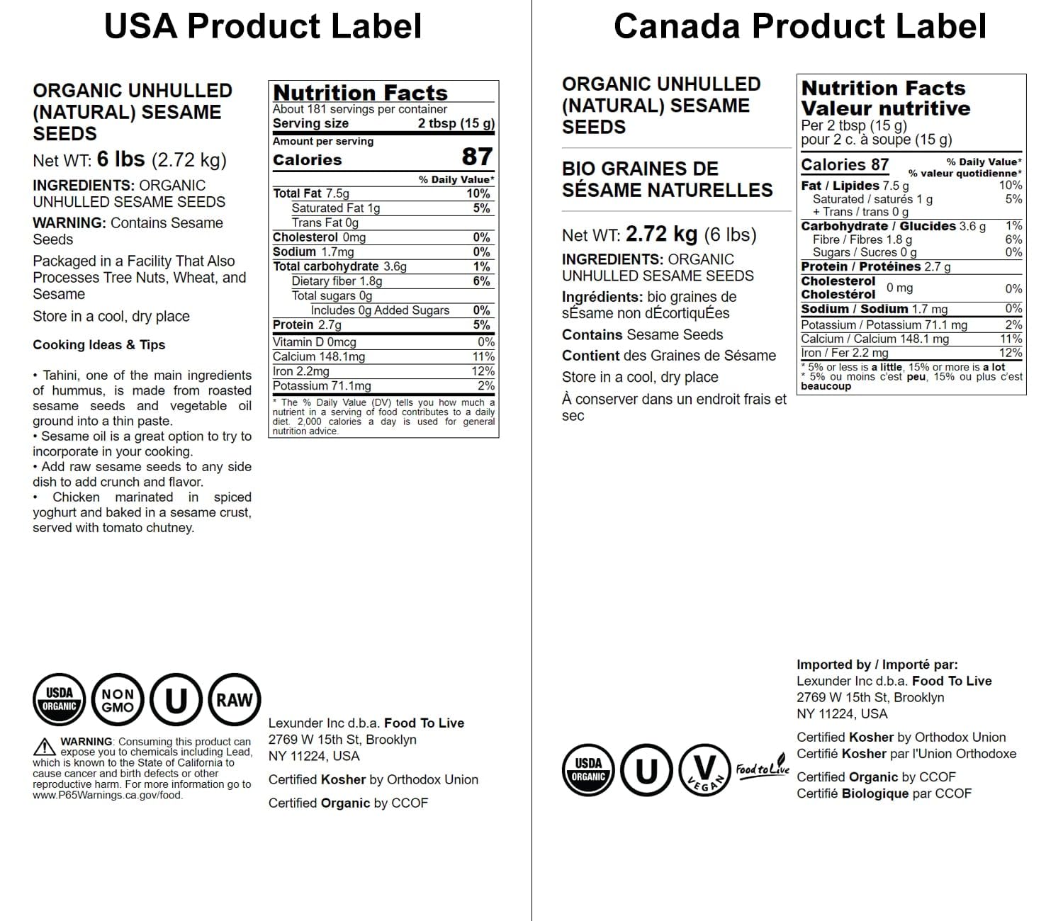 Food To Live Organic Unhulled Sesame Seeds, 6 Pounds — Non-Gmo, Whole Natural Raw White Sesame Seeds, Kosher, Vegan, Bulk, Rich In Dietary Fiber, Protein, & Iron. Crunchy Texture. Great For Baking.