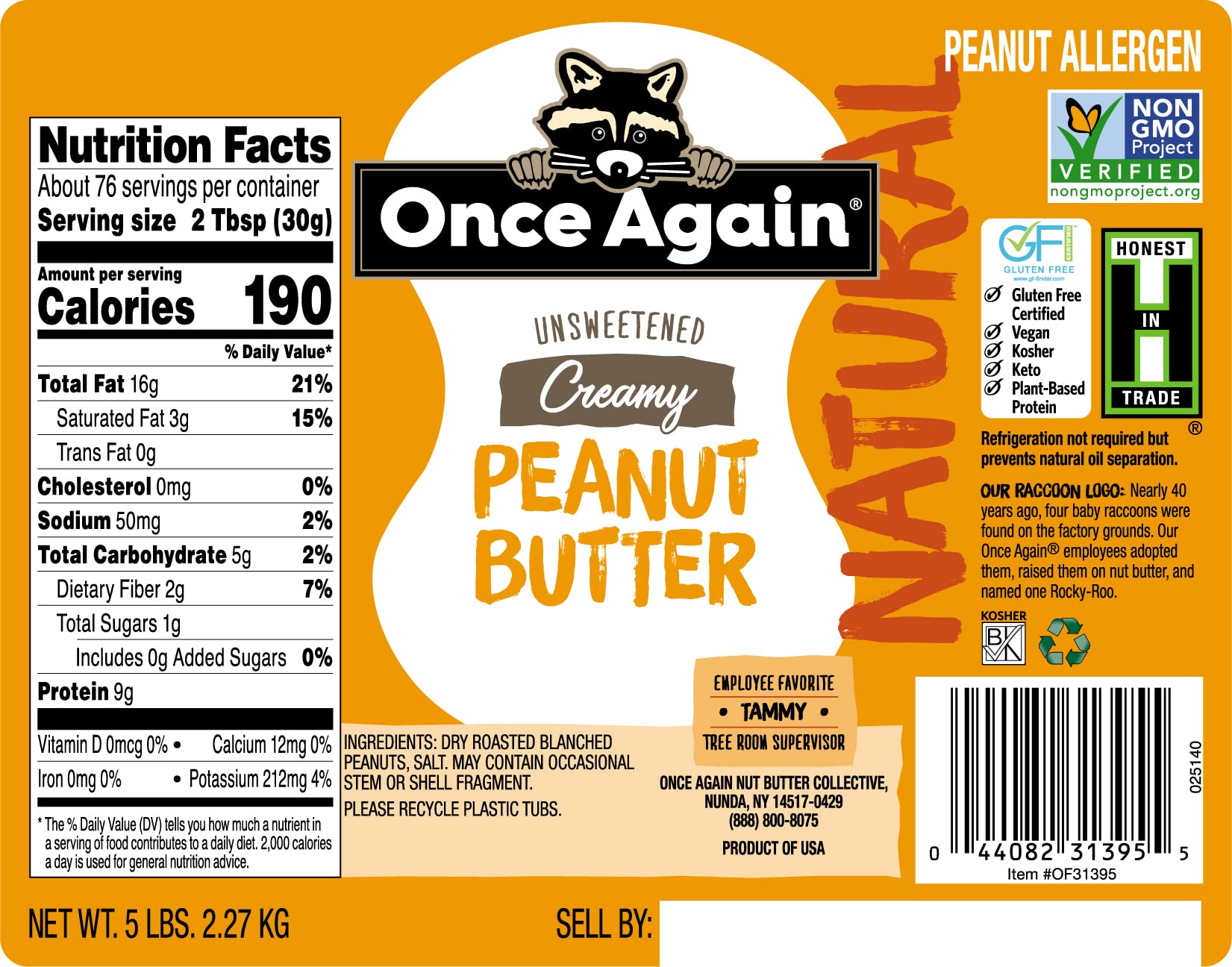 - Q: What are the ingredients in Once Again Natural Creamy Peanut Butter? A: Once Again Natural Creamy Peanut Butter contains only two ingredients: peanuts and a hint of salt. It is unsweetened and does not have any added preservatives, making it a pure and natural choice for peanut butter lovers.