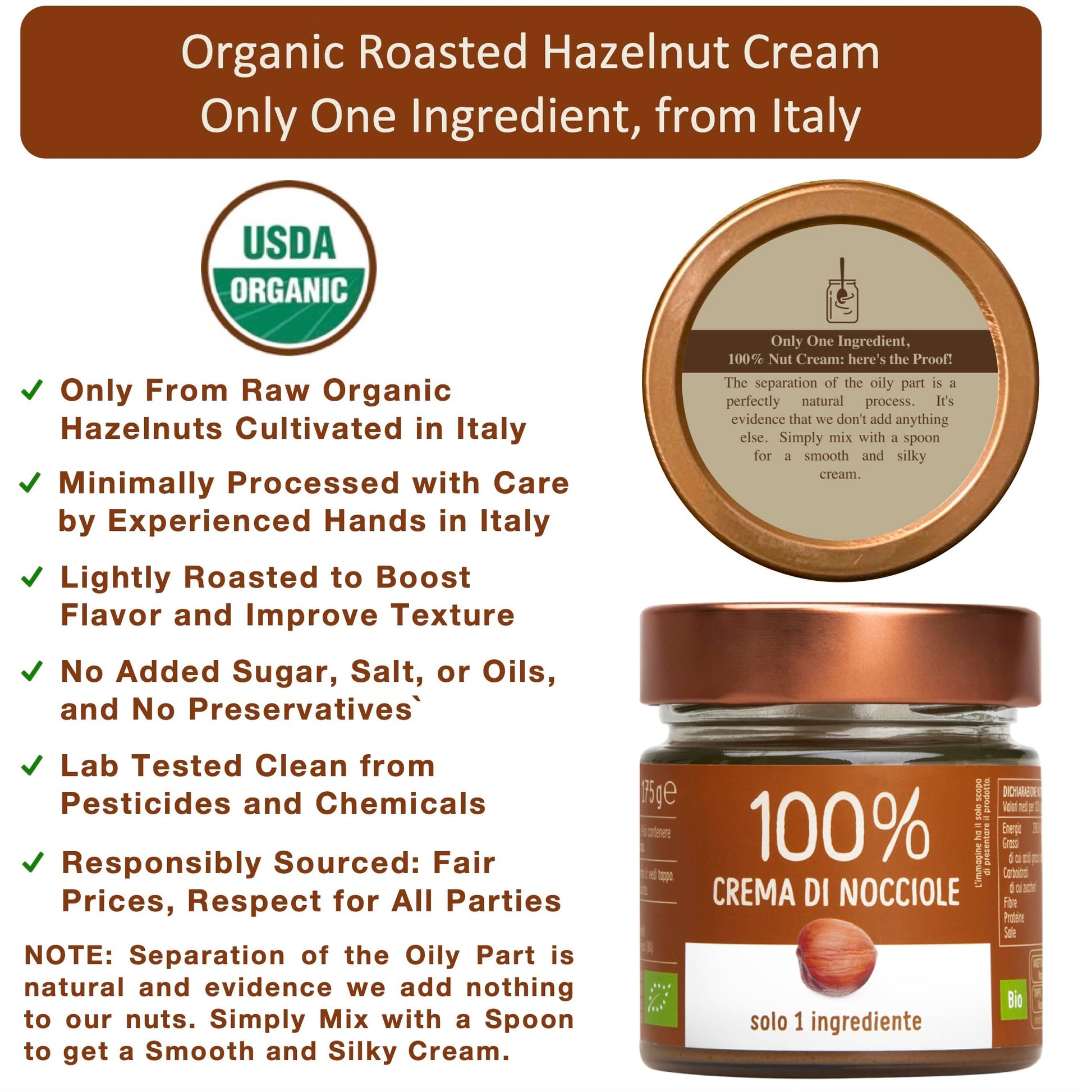 Organic Roasted Hazelnut Cream | Only One Ingredient - 100% Italian Hazelnuts, No Sugar Added, No Palm Oil, Vegan, Paleo, And Keto Friendly, Non-Gmo