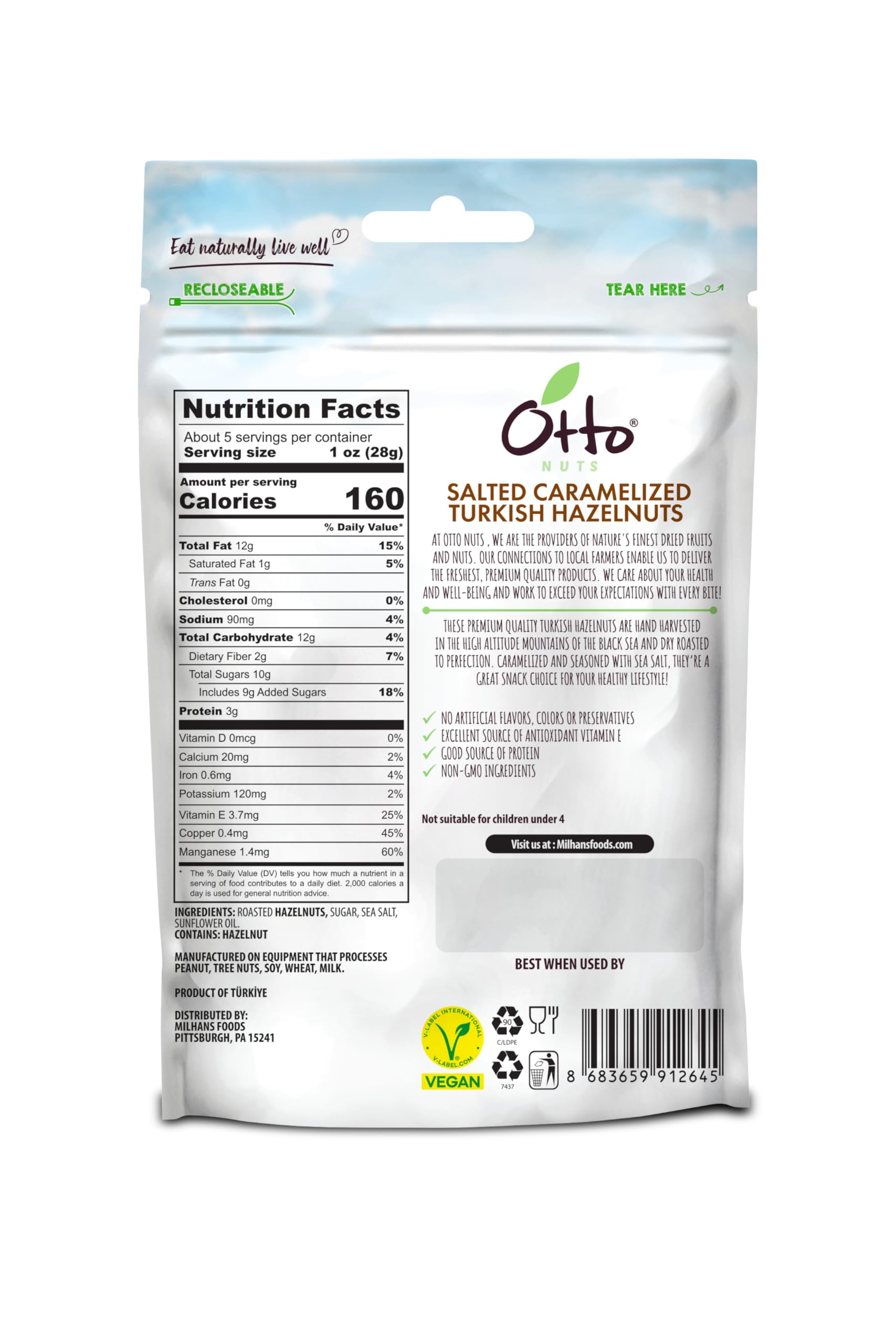Q: What are the main ingredients in Otto Nuts - Salted Caramelized Turkish Hazelnuts?A: The main ingredients in Otto Nuts - Salted Caramelized Turkish Hazelnuts include high-quality Turkish hazelnuts, caramel, and a touch of sea salt, creating a delicious balance of sweet and salty flavors.