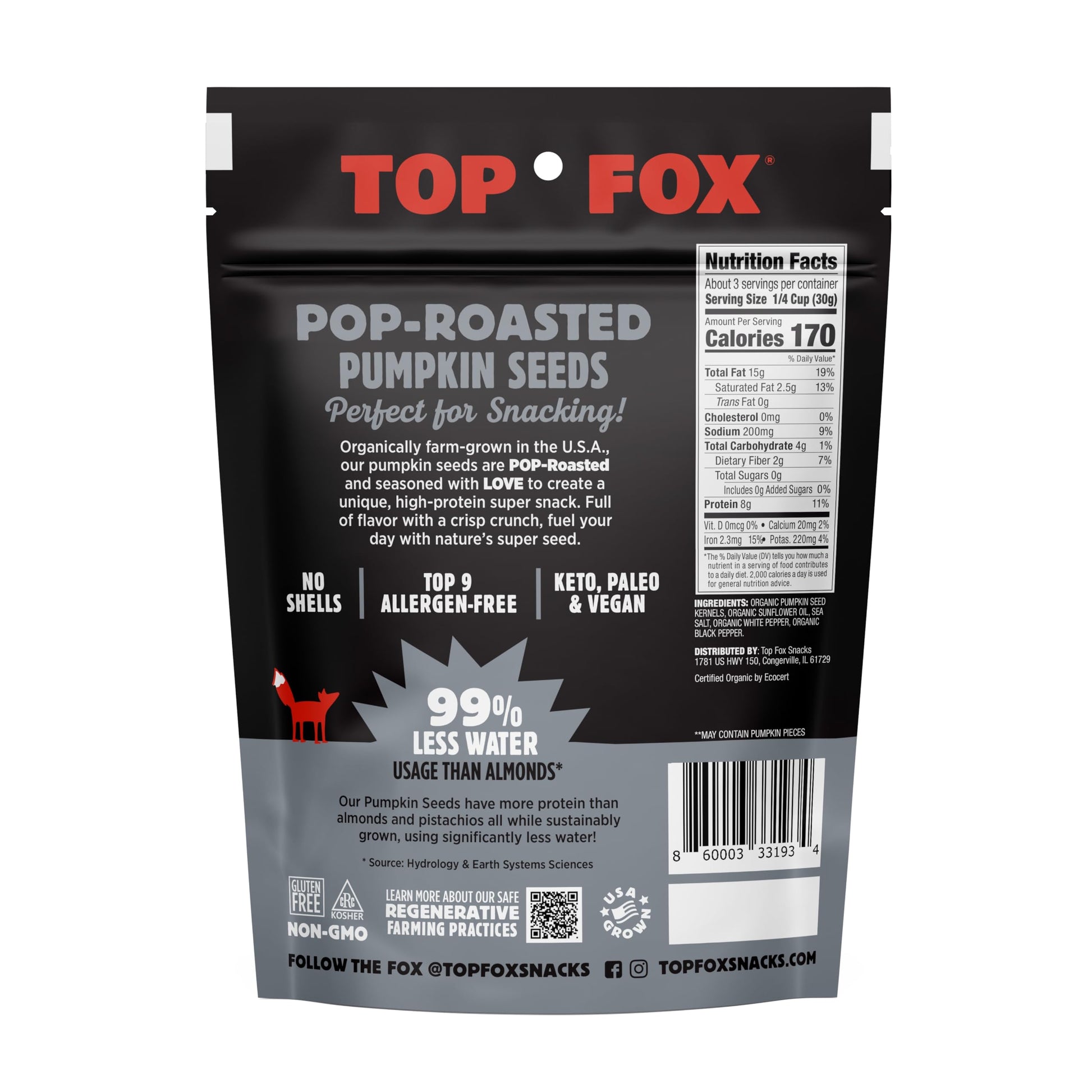 - Q: What are the nutritional benefits of Top Fox Snacks Organic Pop-Roasted Pumpkin Seeds? A: Top Fox Snacks Organic Pop-Roasted Pumpkin Seeds provide 8g of plant-based protein and only 1g of net carbs per serving. They are an excellent source of antioxidants, fiber, omega-3 fatty acids, and essential minerals, making them a healthy snack choice.