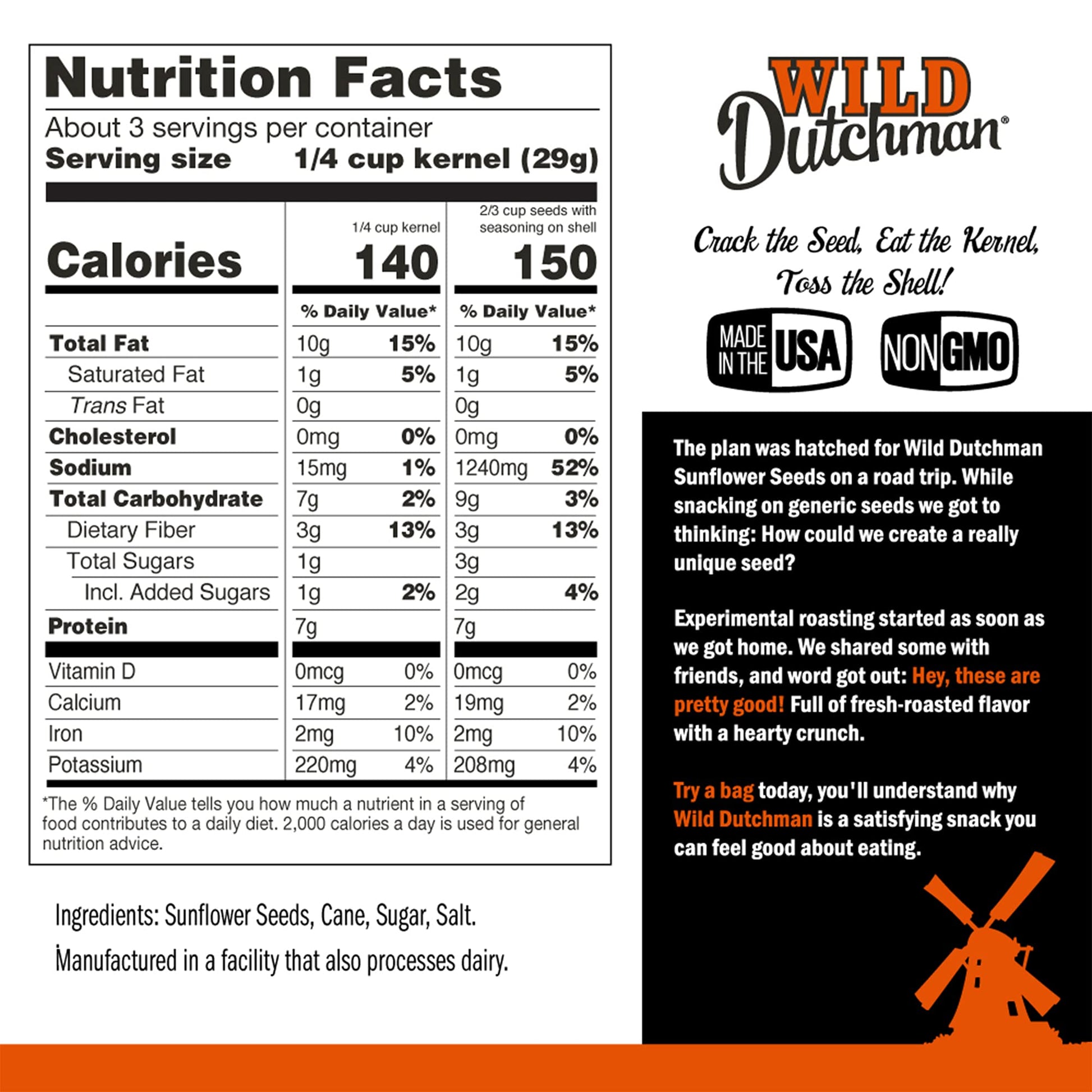 Q: What makes Wild Dutchman sunflower seeds different from other brands?A: Wild Dutchman sunflower seeds are unique because they are small batch roasted from locally grown seeds in South Dakota, ensuring a buttery flavor and extra crunch. They are also perfectly seasoned for all-day snacking without the salty mouth feel.