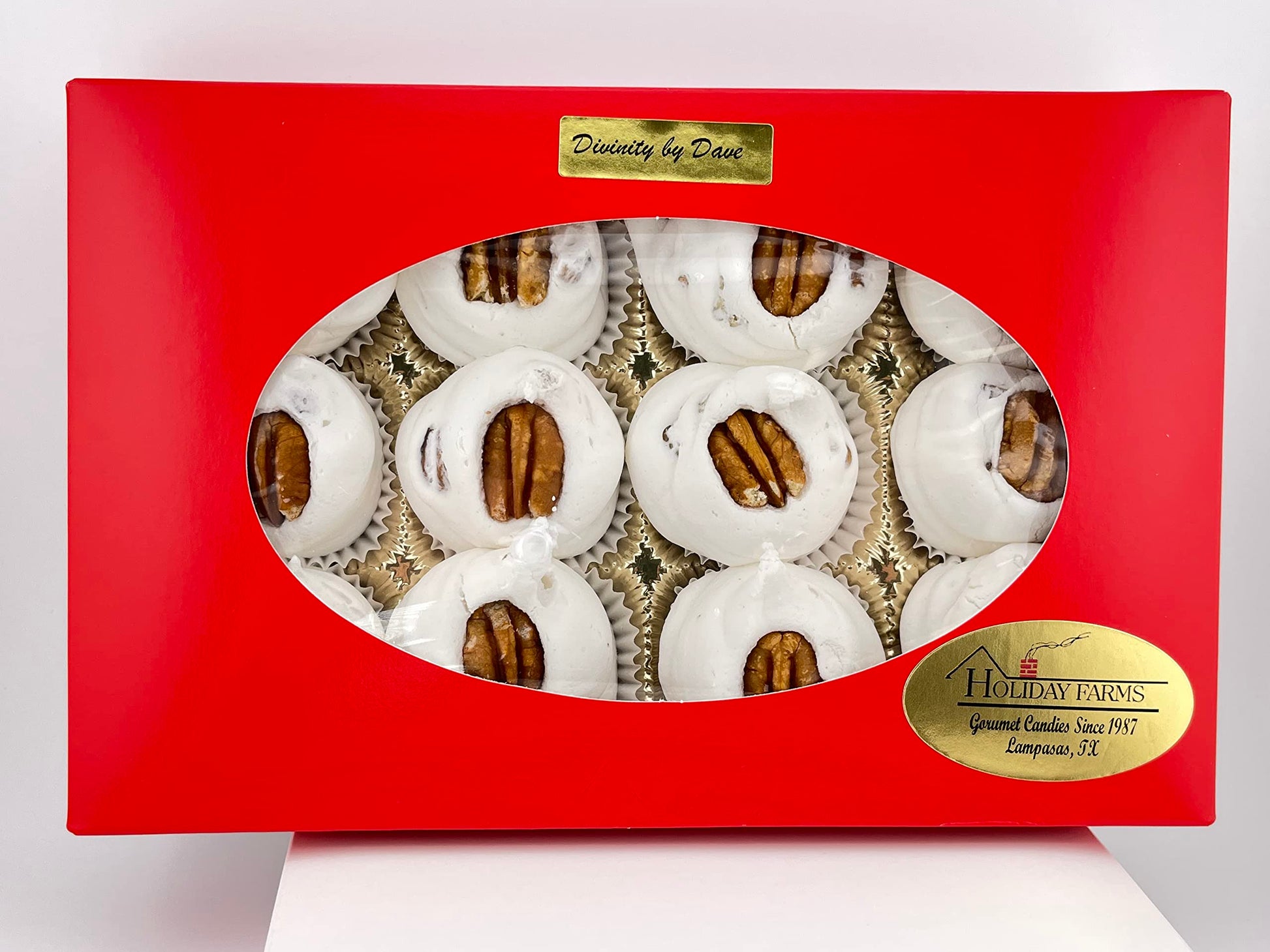 Made With Pure Cane Sugar, Light Corn Syrup And Fresh Pecans. This Divinity Is Light And Fluffy With Pecans In Every Bite (If Ordered With Pecans). Enough For The Whole Family To Enjoy. Comes In A Red Or Maroon Gift Box With Oval Window. Box Pattern May Vary. 12 Pieces, Approximately 12 Oz. 340G.