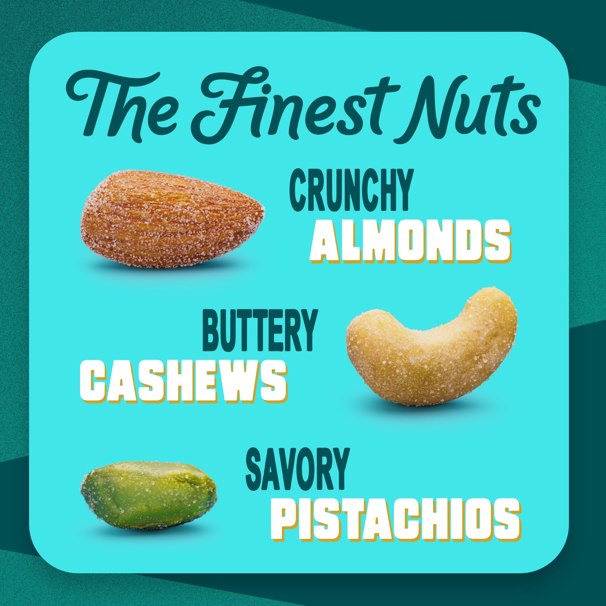 Q: What types of nuts are included in the Blue Diamond Almonds Roasted Sea Salt Deluxe Snack Nuts?A: The Blue Diamond Almonds Roasted Sea Salt Deluxe Snack Nuts include a blend of crunchy almonds, buttery cashews, and savory pistachios, all perfectly roasted and lightly salted for an elevated snacking experience.