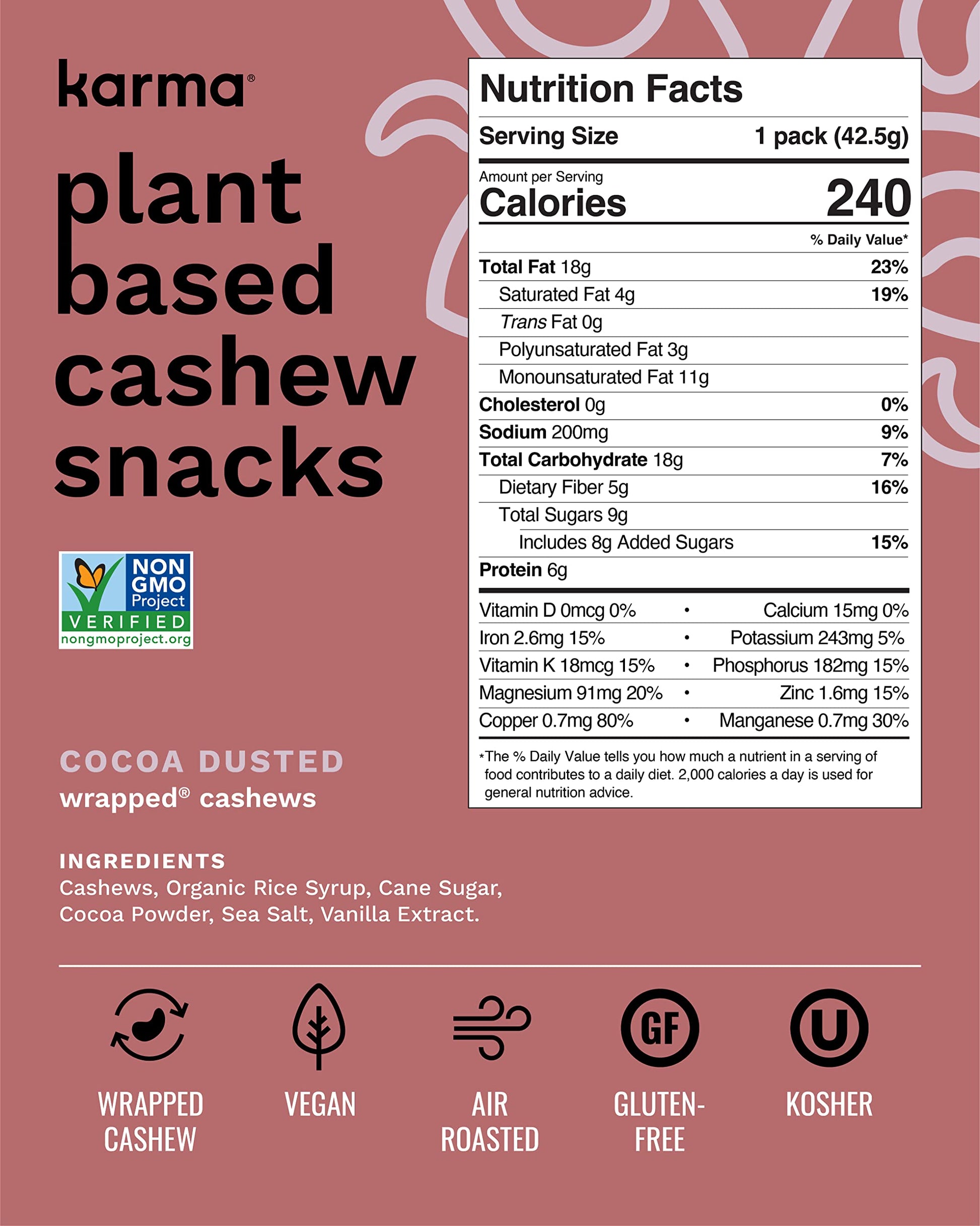 - Q: How are these cashews processed to ensure they are gluten-free? A: Karma Nuts processes its Cocoa Dusted Cashews in a dedicated facility that only handles tree nuts, specifically cashews and coconuts. This ensures that there is no cross-contamination with gluten or other allergens, making them safe for those with gluten sensitivities.