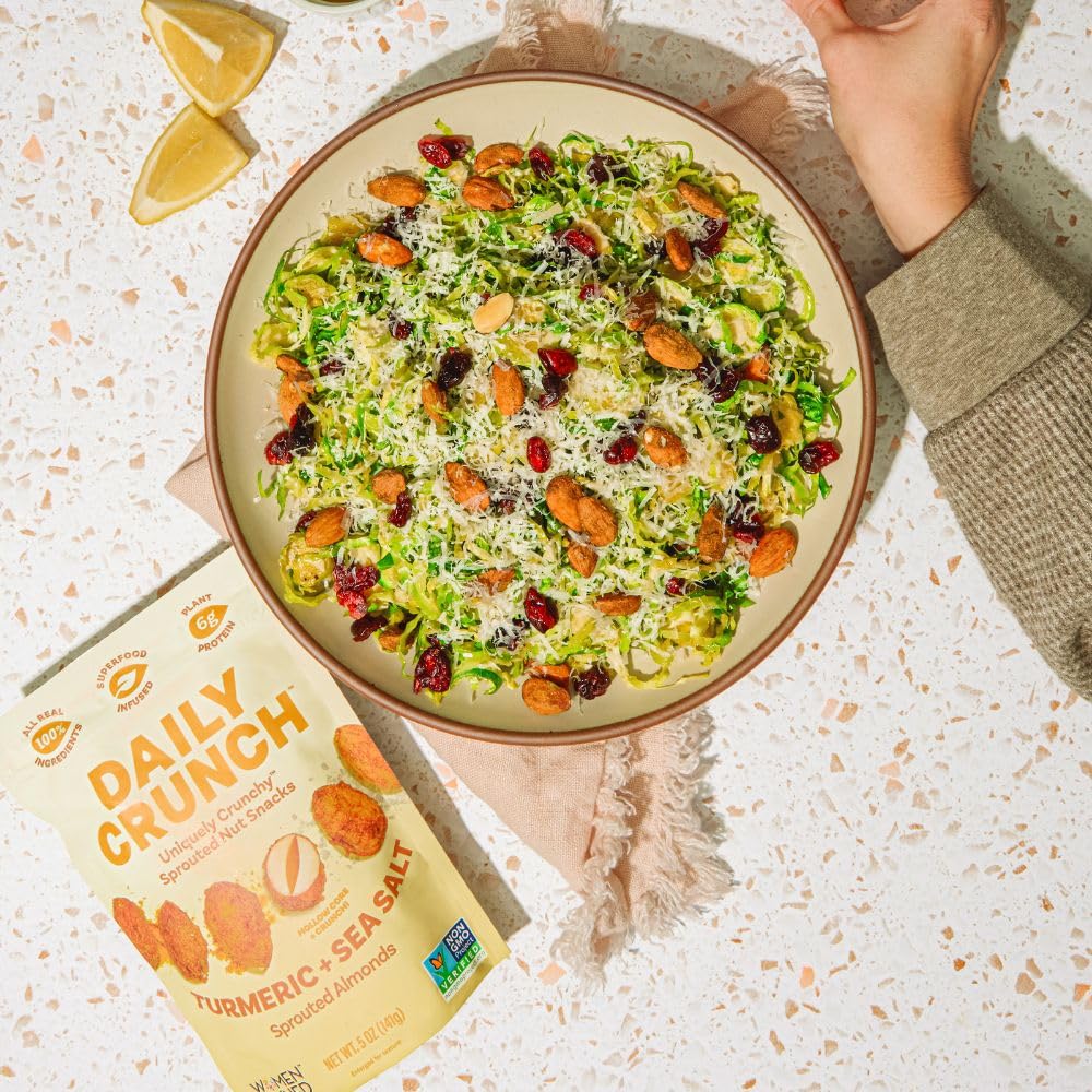 - Q: What is the shelf life of Daily Crunch Turmeric + Sea Salt Sprouted Almonds? A: Typically, Daily Crunch Sprouted Almonds have a long shelf life when stored in a cool, dry place. Check the packaging for specific expiration dates, and enjoy them as a nutritious snack that stays fresh for longer.