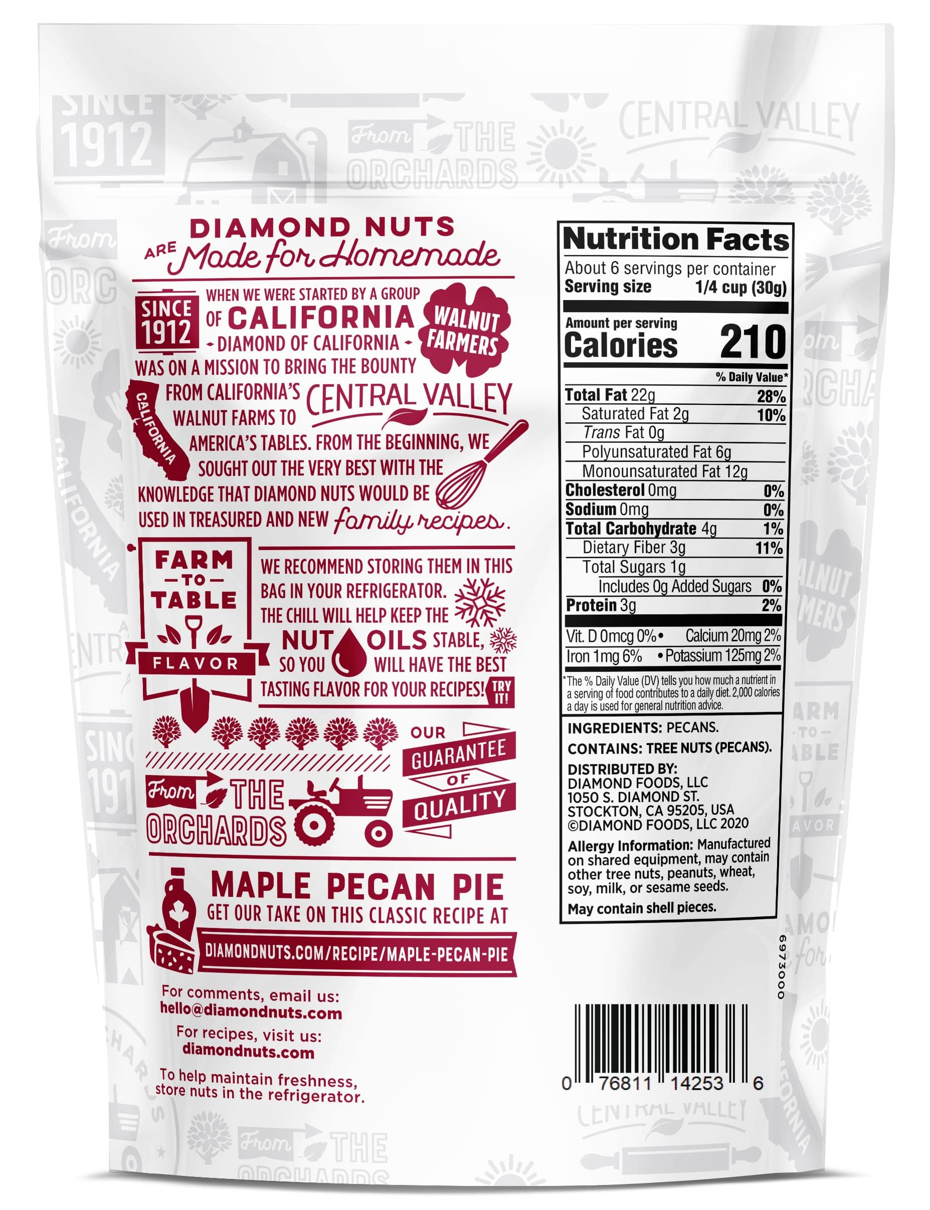 - Q: What is the packaging size of Diamond of California Pecans? A: This product comes in a 6-ounce pack, and you receive a total of 12 packs, making it a convenient choice for stocking up on healthy snacks or using them in various recipes.