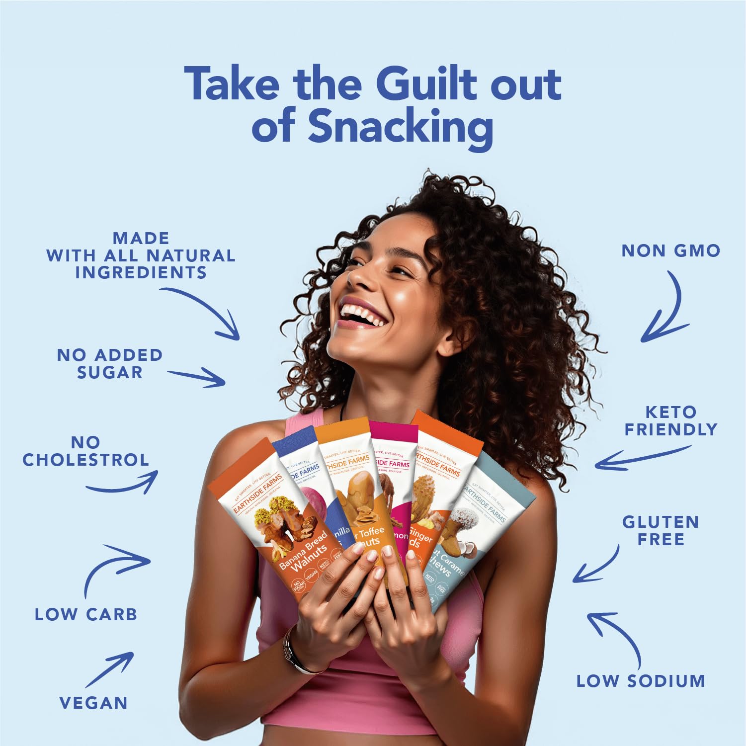 Q: What are the main flavors included in the Earthside Farms Candied Nuts variety pack?A: The Earthside Farms Candied Nuts variety pack includes delicious flavors such as Maple Cinnamon Pecans, Coconut Caramel Cashews, Banana Bread Walnuts, Blueberry Vanilla Cashews, and Orange Ginger Almonds.