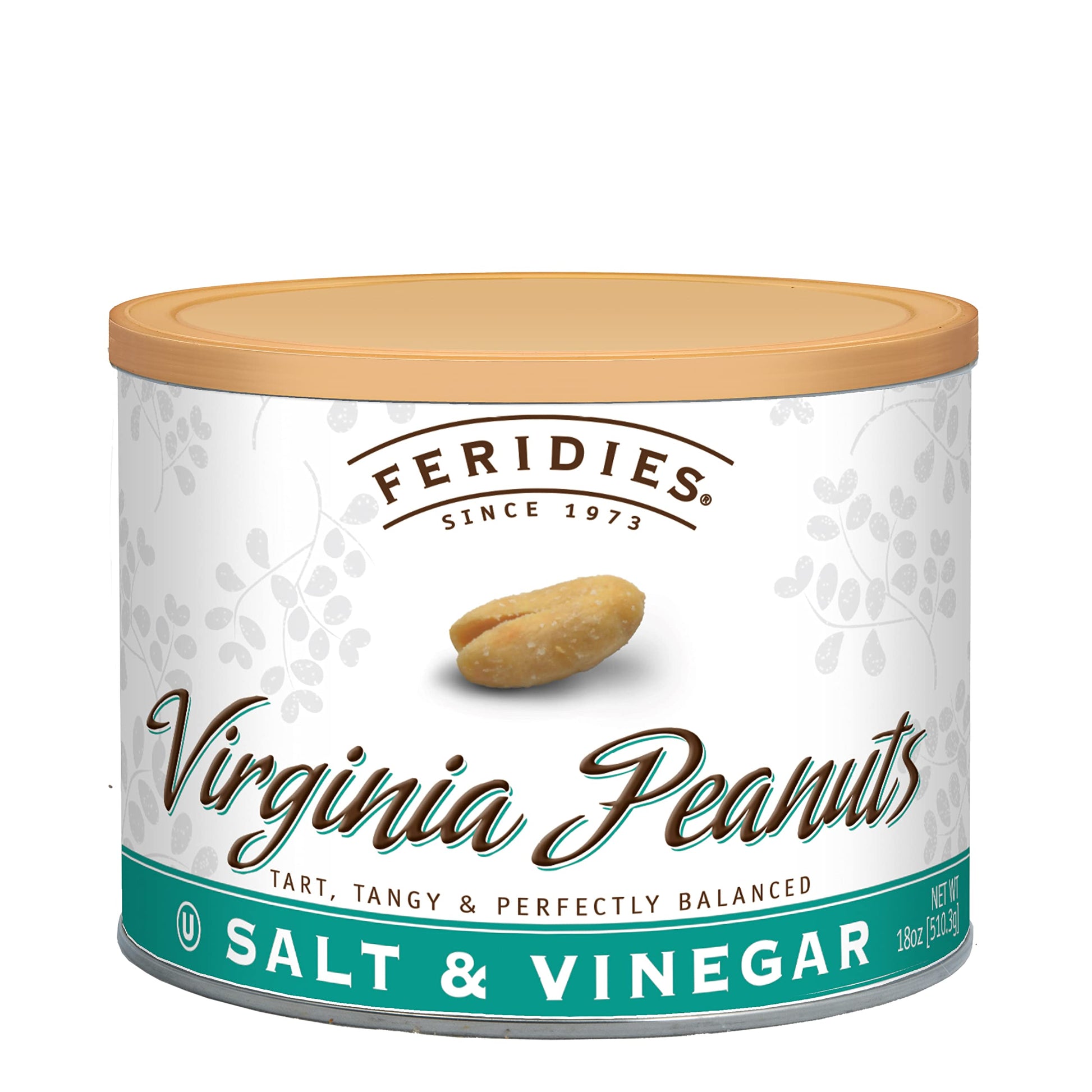 - Q: What size does the FERIDIES peanut tin come in? A: The FERIDIES Salt and Vinegar Virginia Peanuts are available in an 18 oz resealable gourmet snack tin, ensuring freshness and convenience for snacking.